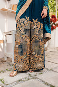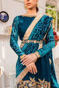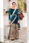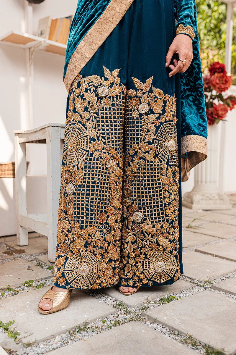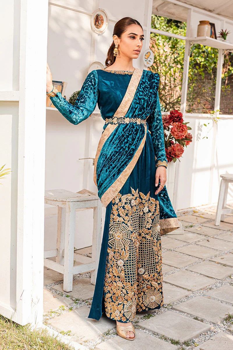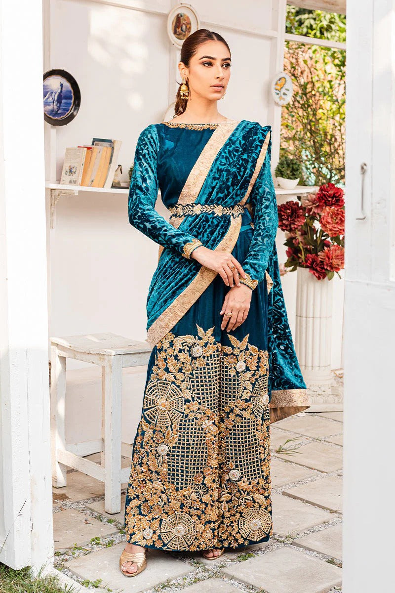 This beautiful teal green velvet blouse with embroidered neckline and sleeves is paired with golden zari heavily worked sharara pants and a pallachi saree drape. Finishing its look with a cutworked belt.