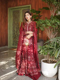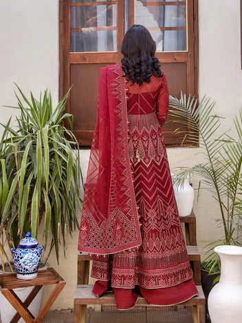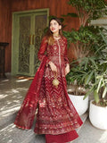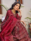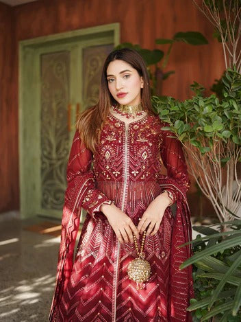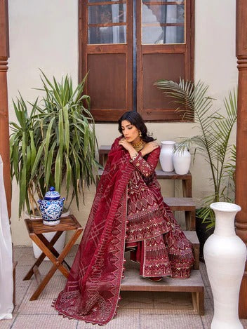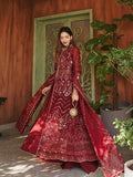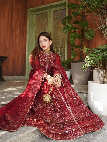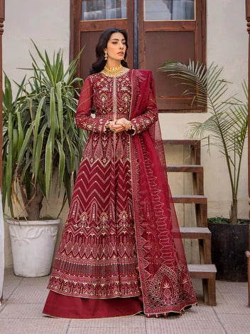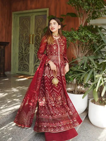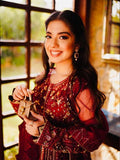 Presenting a spell binding look curated on net base rendered in majestic shade of maroon. The heavily embroidered pishwas is enhanced with gleaming gold hand embellishments and artistic cutwork on the sleeves. The embroidered organza dupatta is layered with similar cutwork details. Paired with flared sharara pants to complete the look.