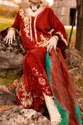 Introducing "Aqeeq" in a two-tone blend of brick and ruby red. This ensemble showcases a long, four-kali front-open kurta paired with laser-cut culottes, creating a stunning contrast. The two-tone velvet shirt features intricate ari work on the front open kurta, adorned with emeralds, champagne beads, and sequins, adding a touch of regal opulence. This exquisite outfit is a perfect choice for special occasions.