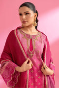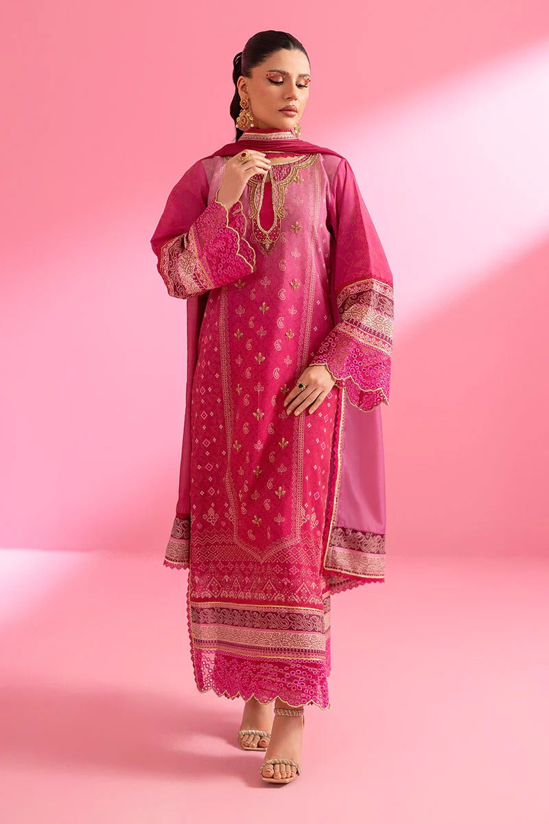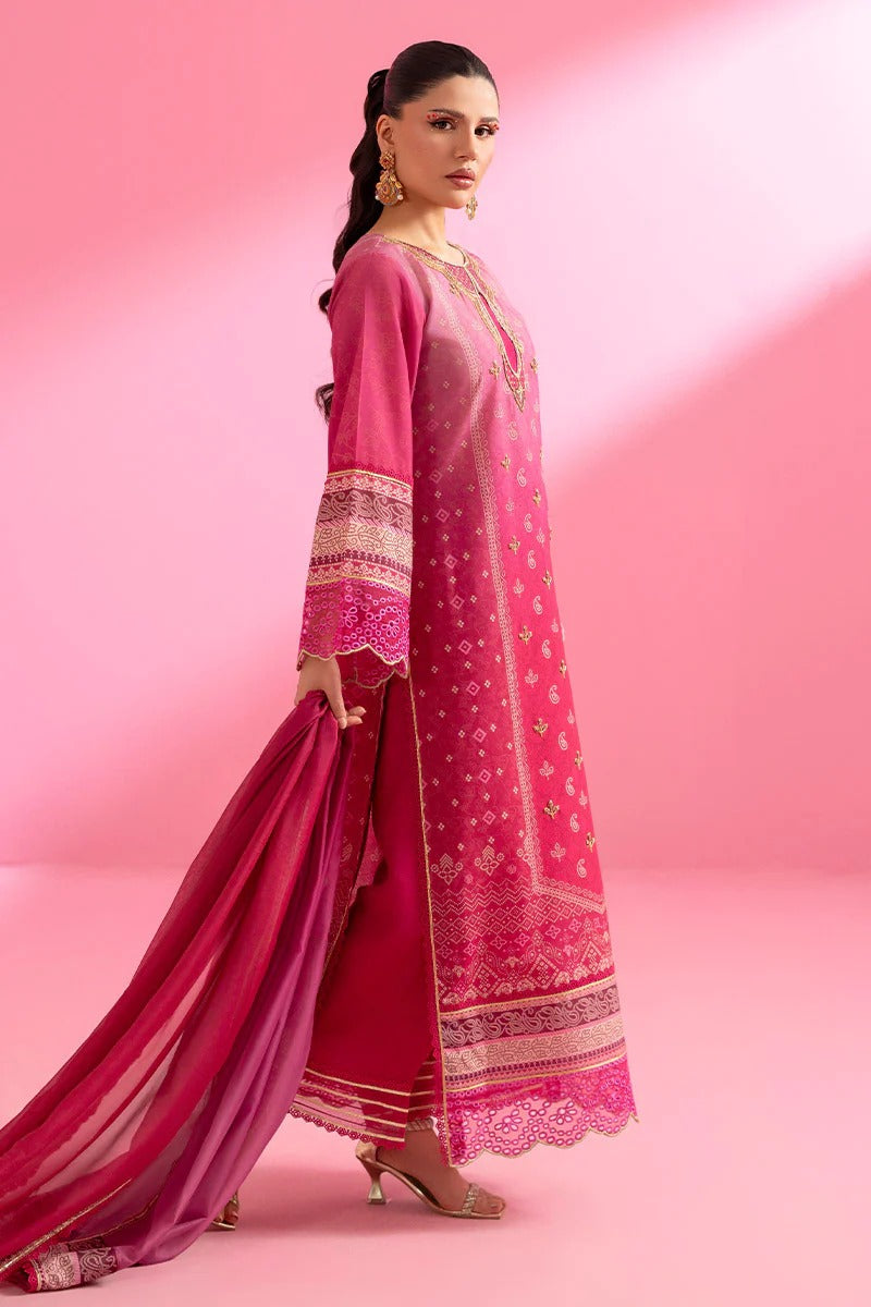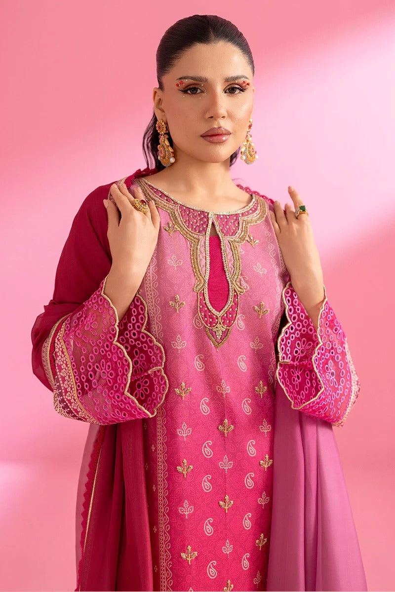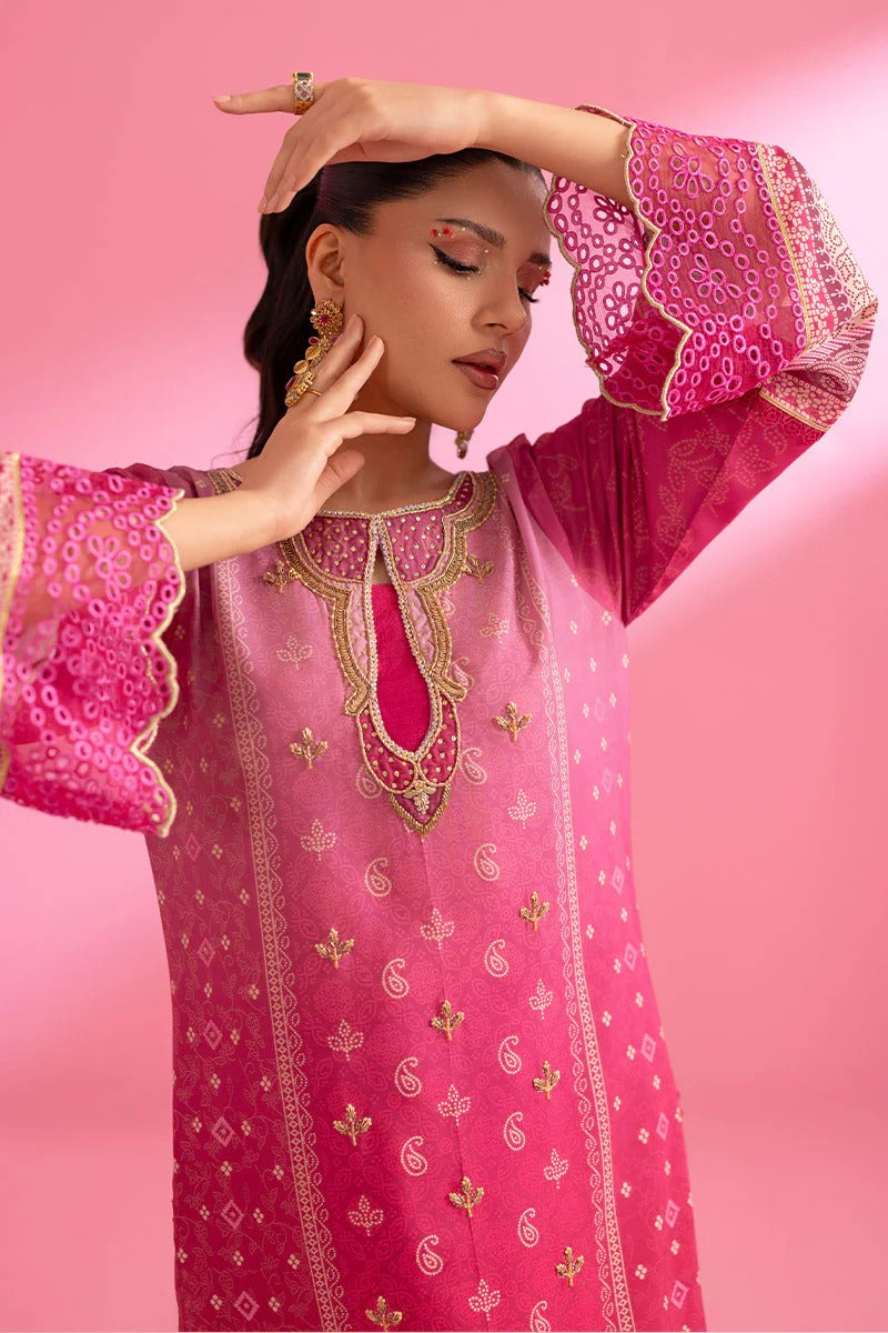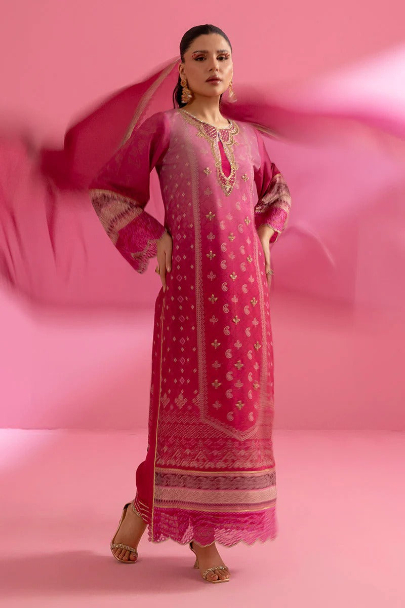 The Azalea tunic features a striking ombré long silhouette in vibrant shocking pink, adorned with intricate handwork of sequins, kora, and stones. Paired with culotte pants embellished with gota accents, it’s styled with a crepe silk ombré dupatta, finished with delicate lace detailing.