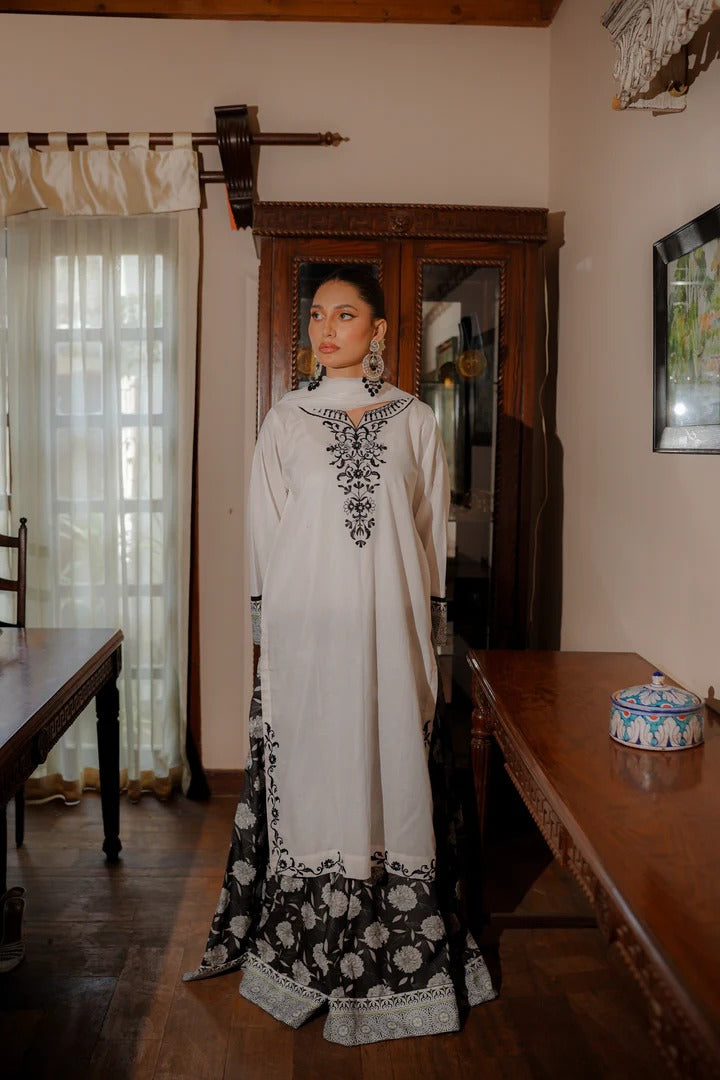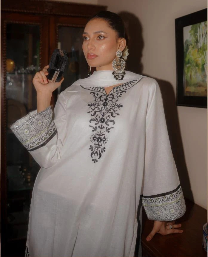 Beautifully embroidered shirt with detailed embroidery on the neckline and hemline. The sleeves feature a printed design borders, adding a refined touch.