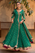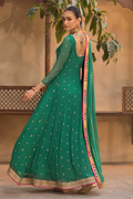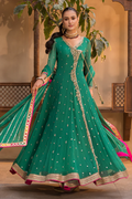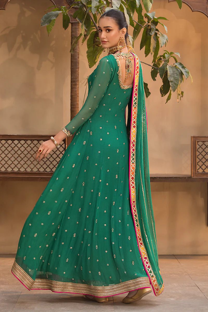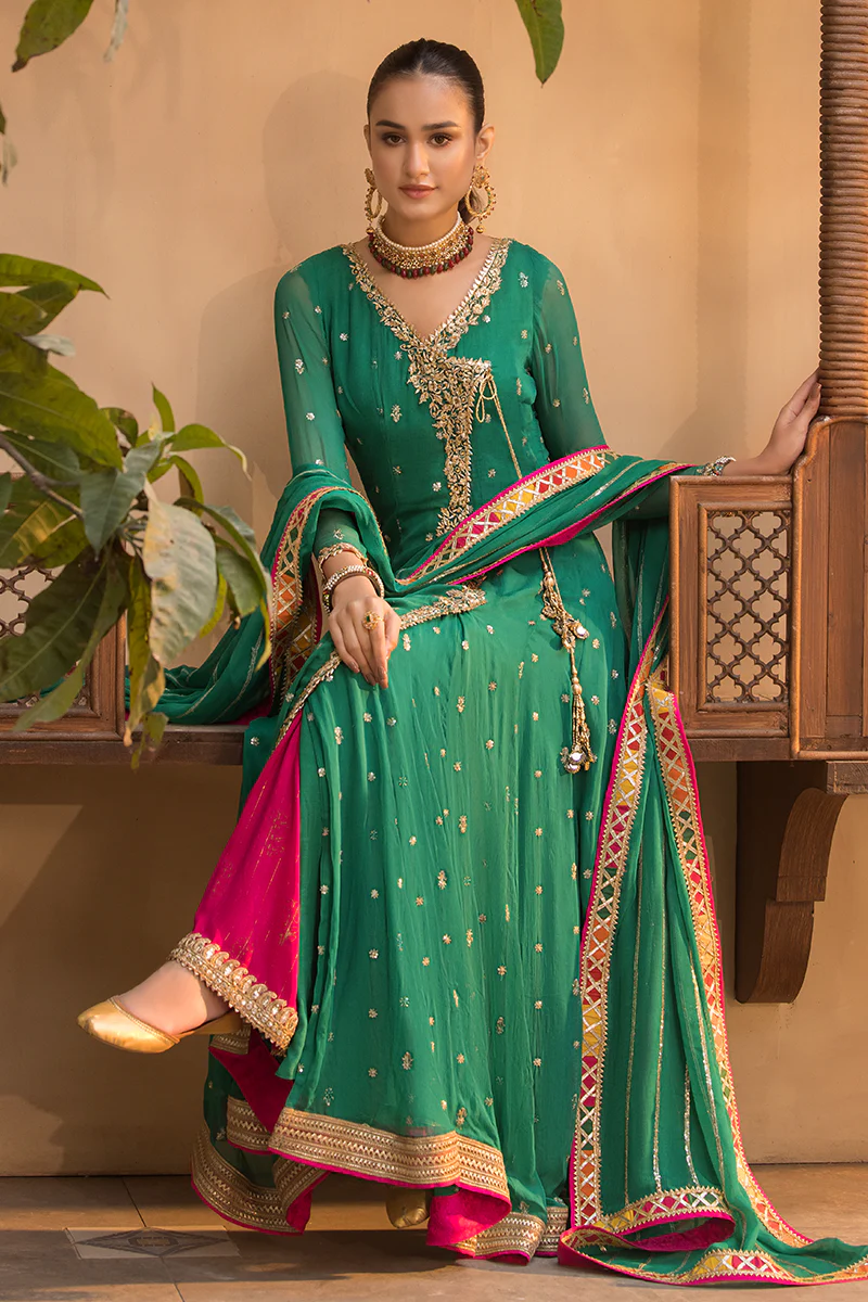 Traditional flared floor length angrakha embelished with gota work paired with dupatta and block printed ajar pants