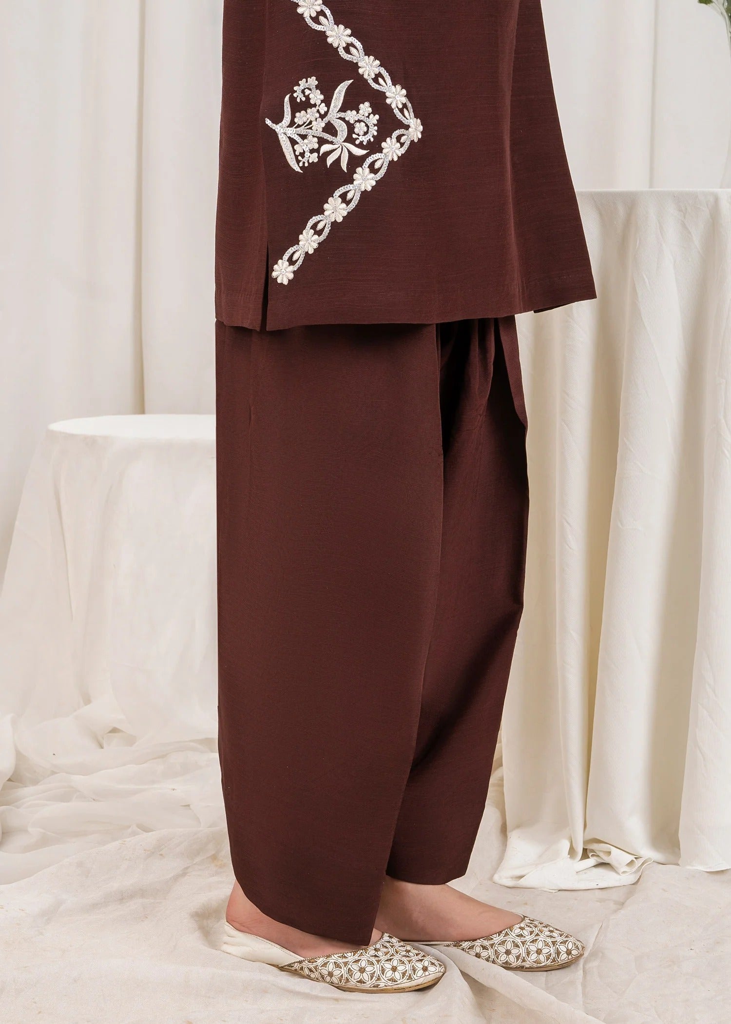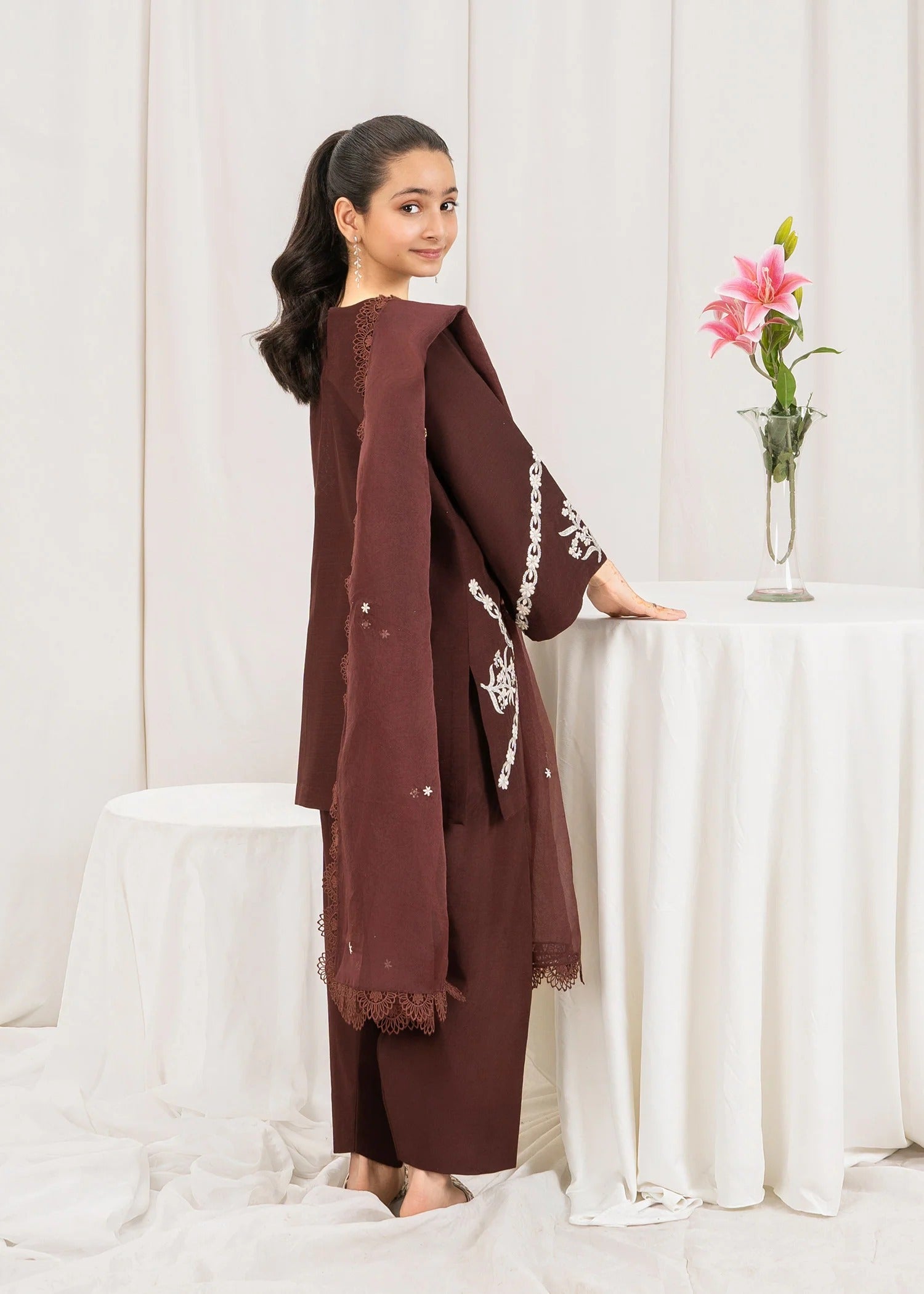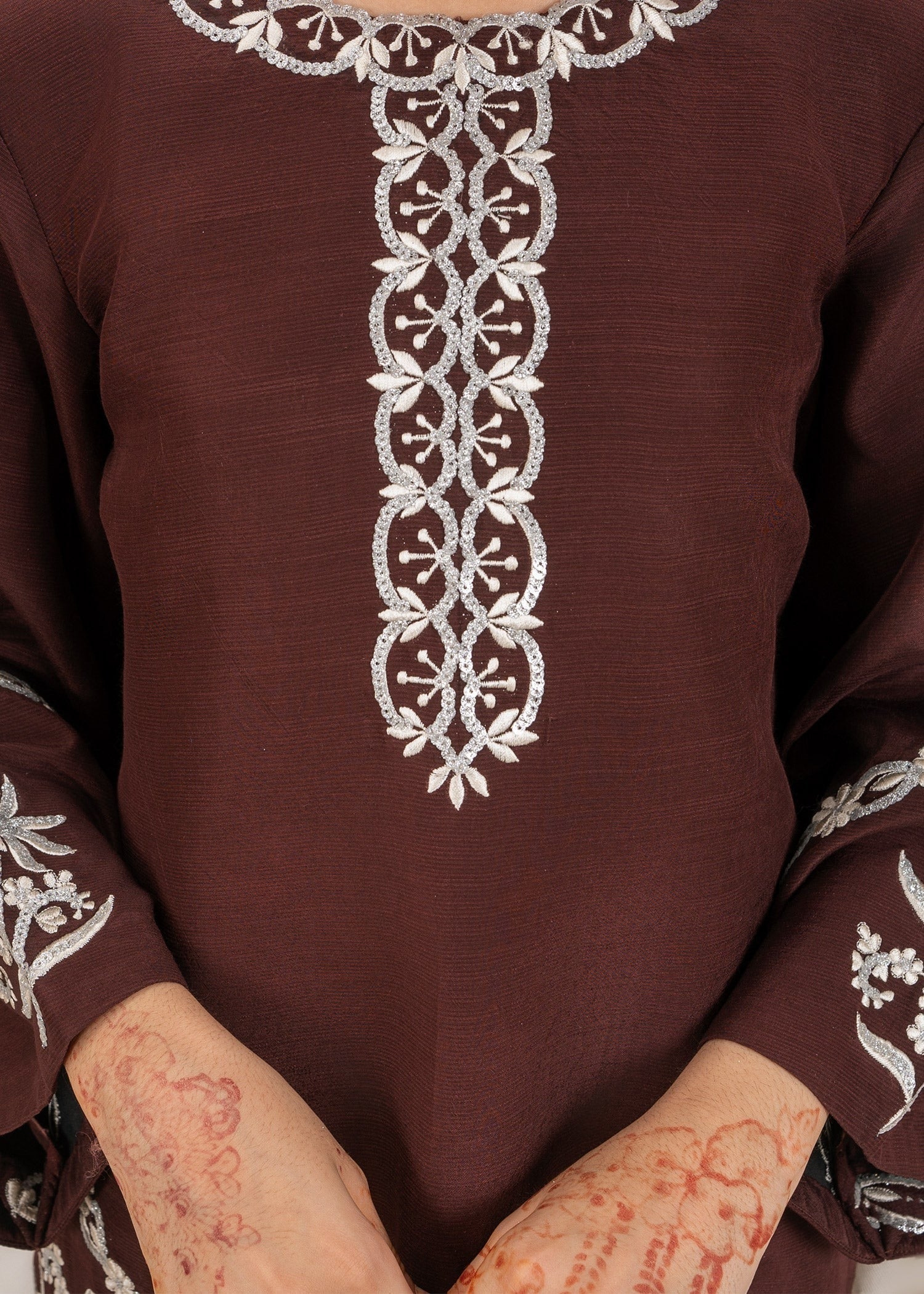 This 3 piece brown embroidered silk dress for kids with an organza dupatta is the epitome of timeless elegance. The deep brown silk shirt is beautifully adorned with intricate embroidery, adding richness and texture to the ensemble. Paired with matching silk trousers for a seamless silhouette, the outfit is completed with a delicate organza dupatta that brings a touch of lightness and sophistication. The contrast between the lustrous silk and airy organza creates a perfect balance, making this outfit ideal for festive occasions, formal events, or evening gatherings. Classic yet contemporary, it’s a graceful choice for any refined wardrobe.