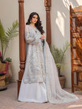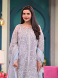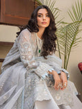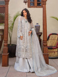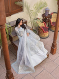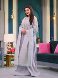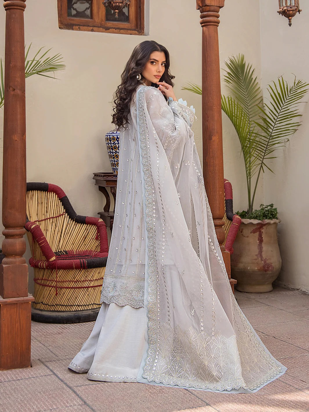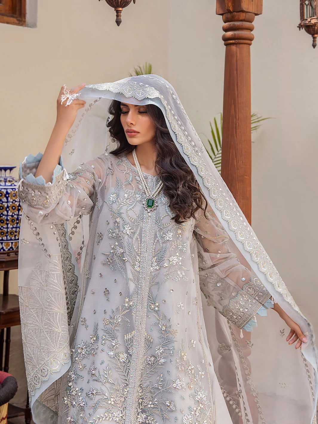Crafted on ethereal net base this exquisite ensemble in a dreamy grey color palette is curated with intricate threadwork and sequins enhanced with hand embellishment all over. Completing the look with embroidered organza dupatta, finished with scalloped embroidered borders with an additional layer blue organza. The silk sharara pants are also enriched with embroidered border, making it a marvelous look for any occasion this season.