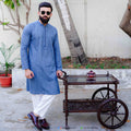The classic faded blue color makes it versatile for various occasions, whether it’s a casual gathering or a formal event. The chikankari work adds a touch of sophistication and cultural charm to the attire. It’s a timeless piece that will never go out of style.