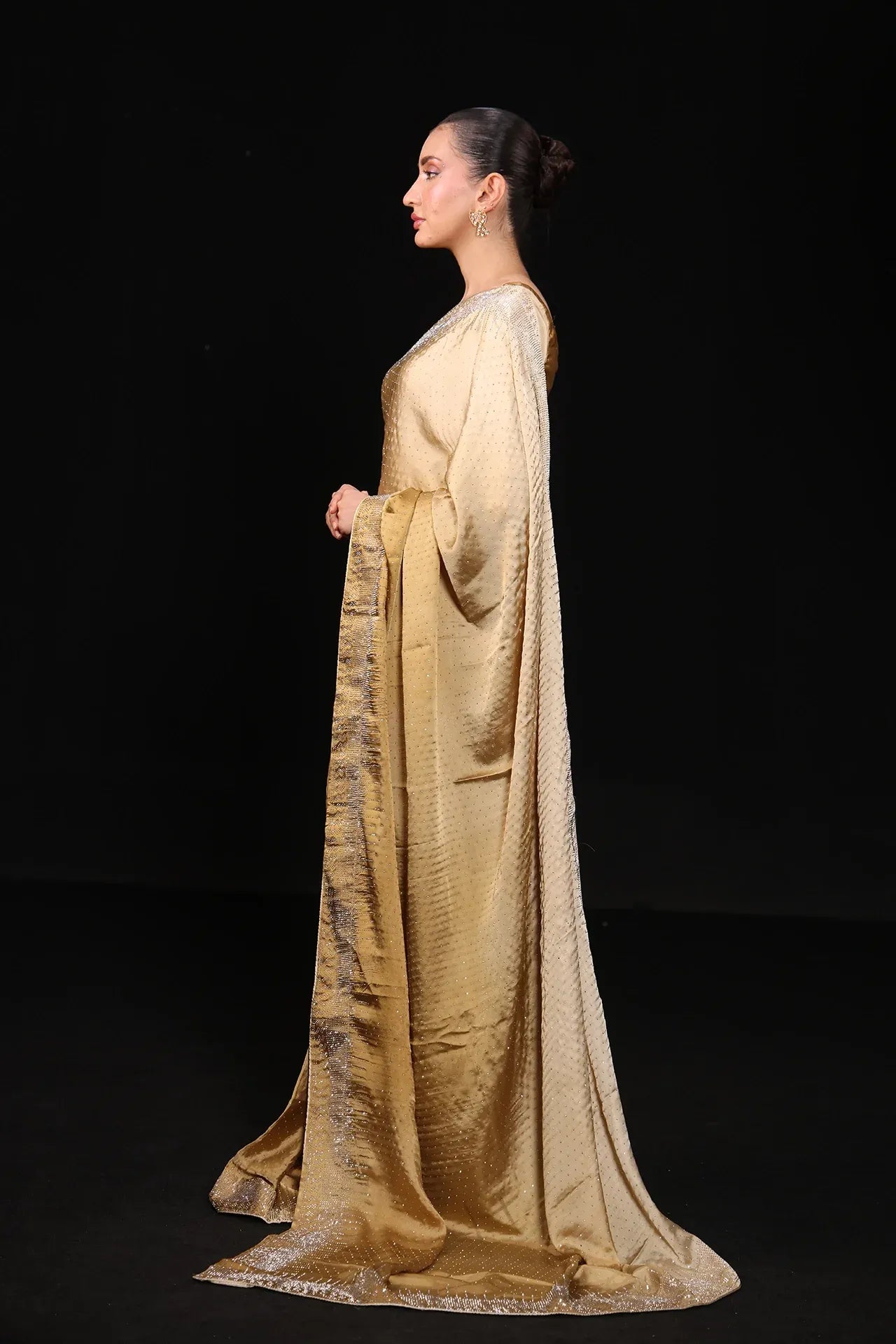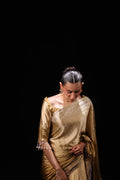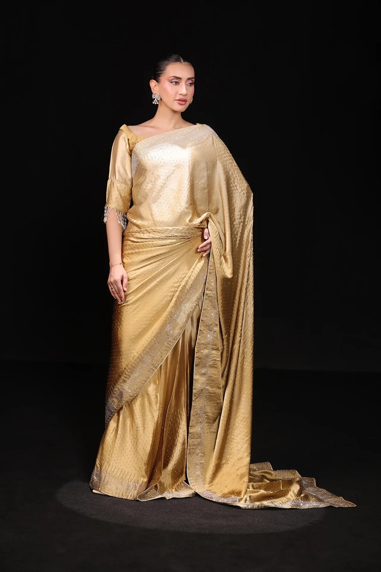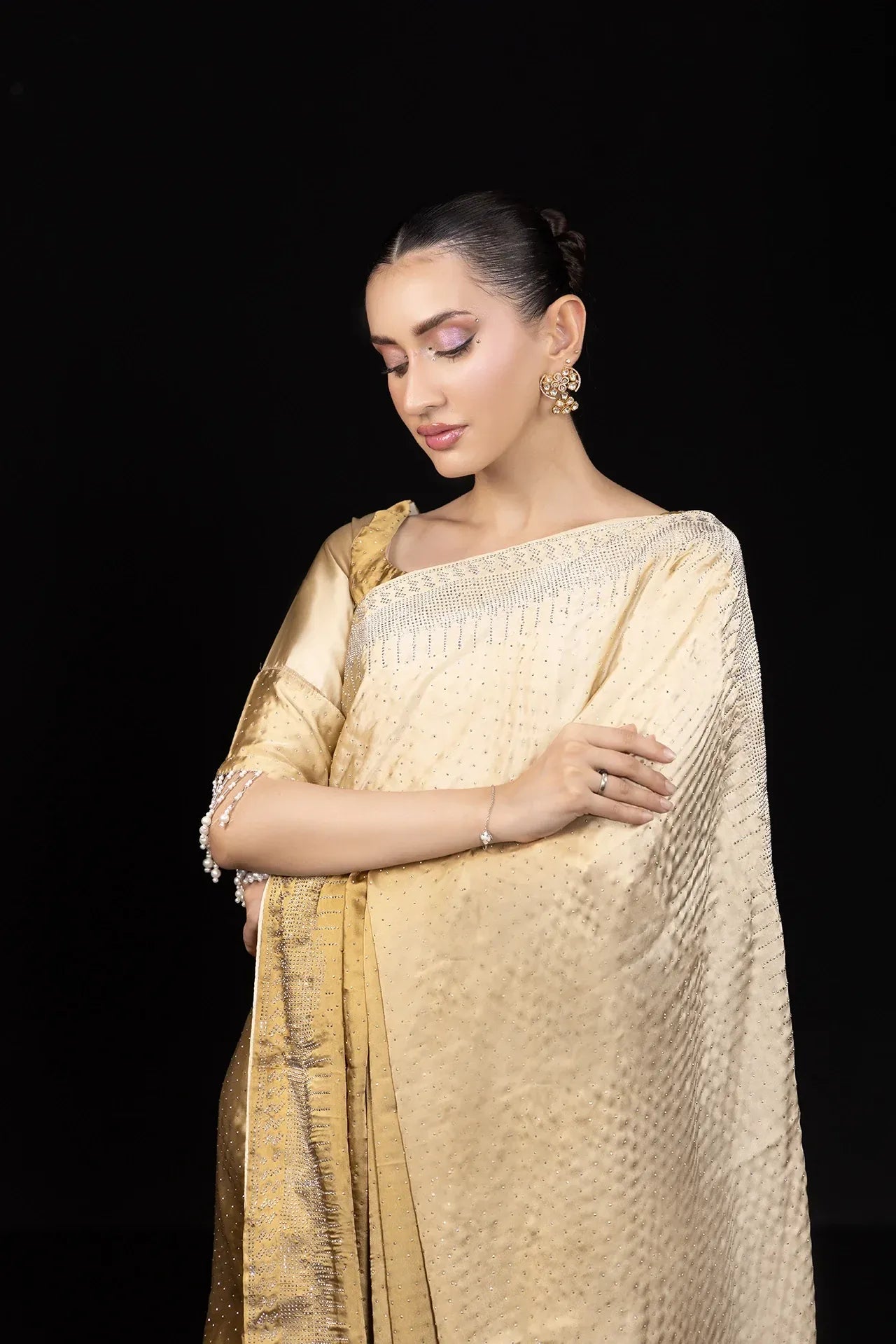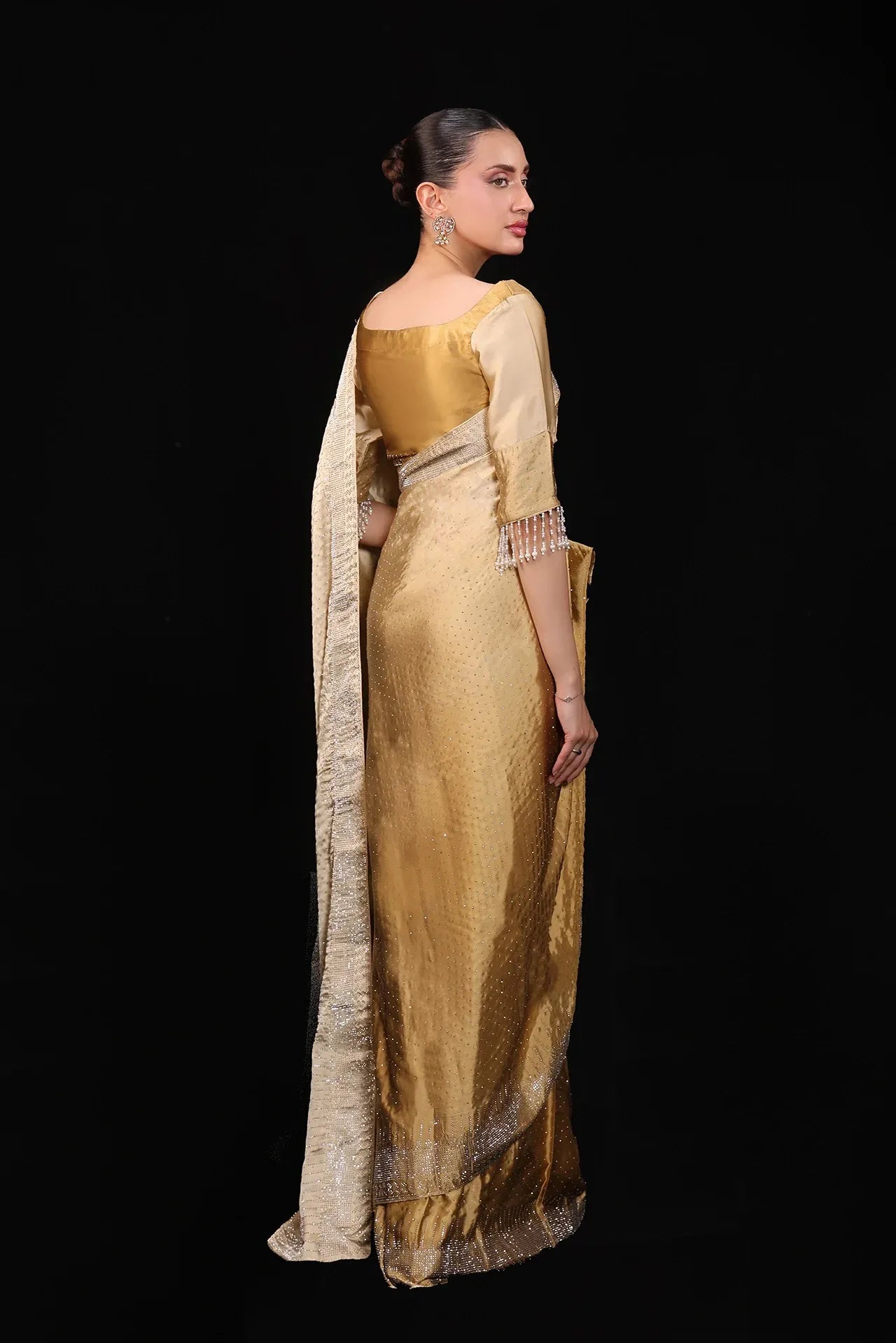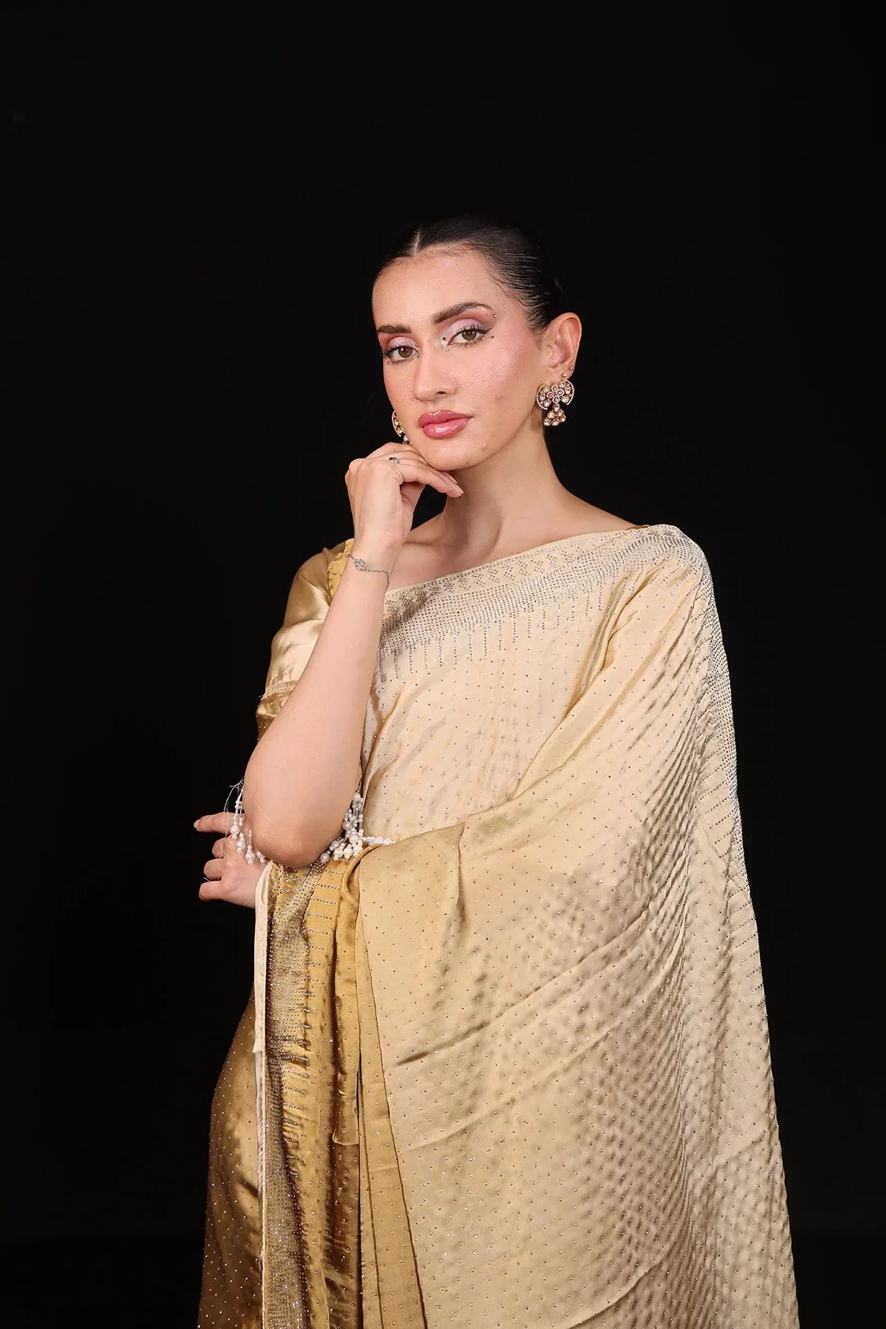 Golden Muse is a vision of radiance. With ombré gold tones flowing seamlessly through Finest silk, this saree reflects light like a dream. Rhinestones are delicately scattered across the fabric, giving it an ethereal sparkle. The blouse is finished with a graceful fit a modern take on regal beauty.