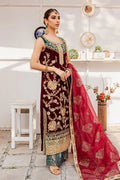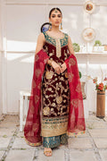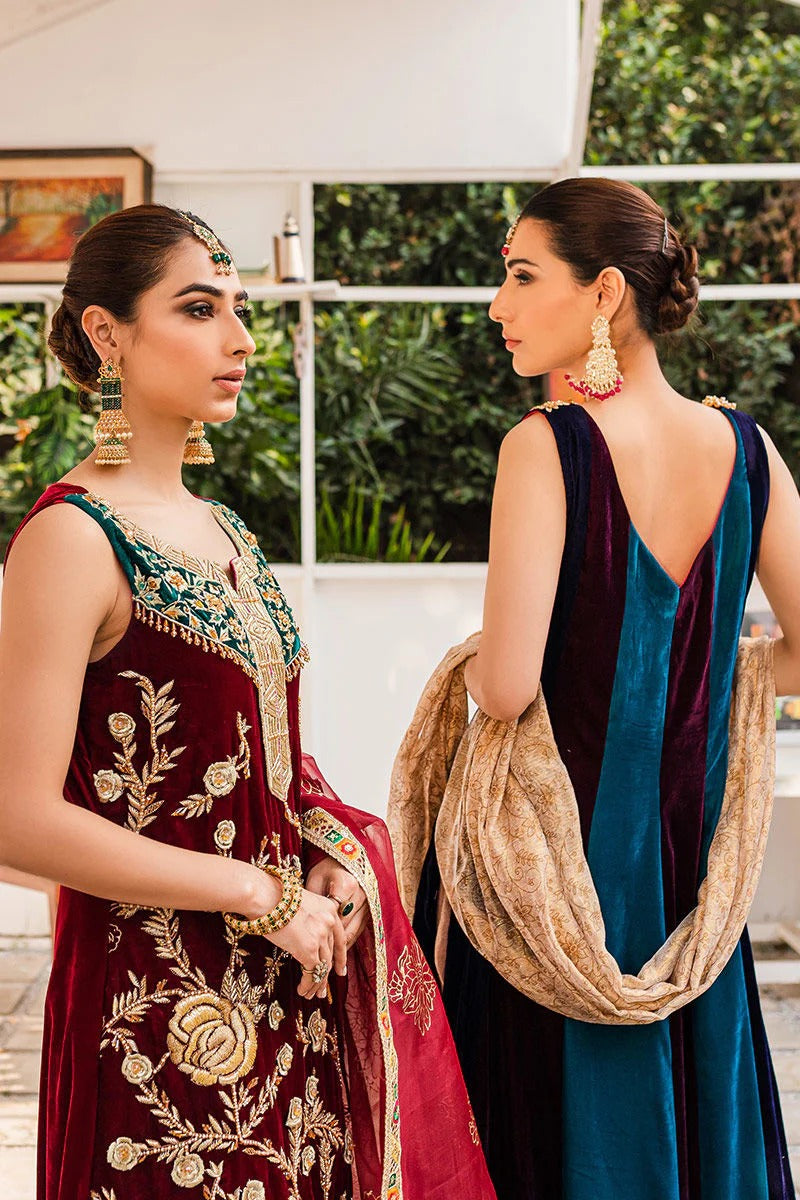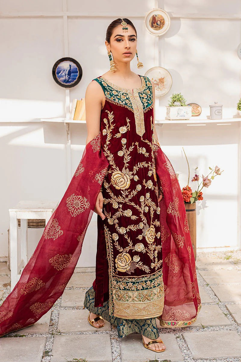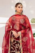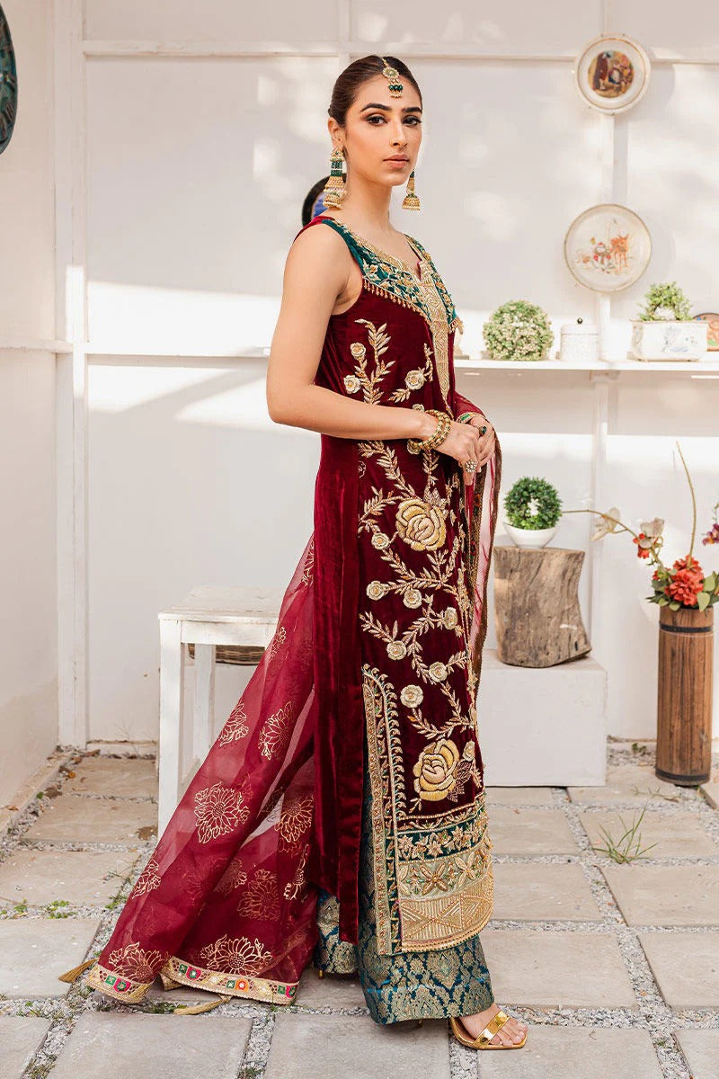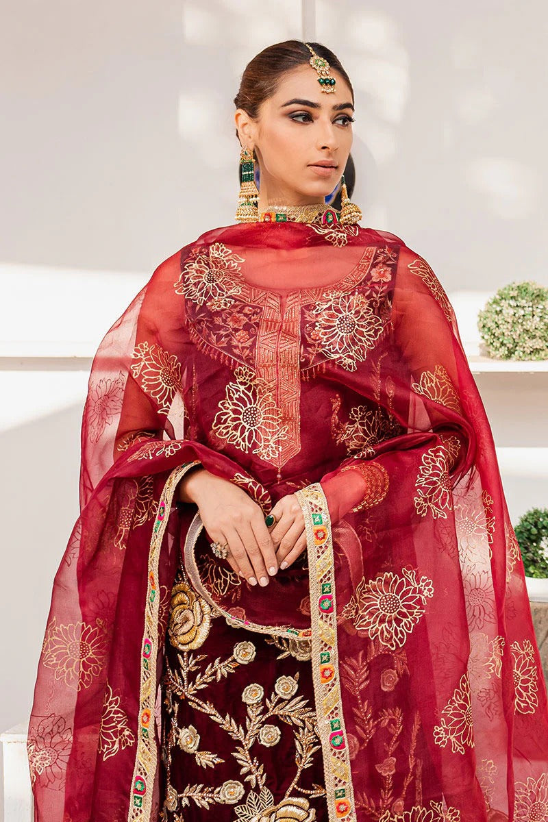 Traditional hand-embroidered long shirt with zari and resham work, paired with jamawar pants and organza block printed dupatta.