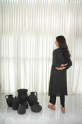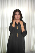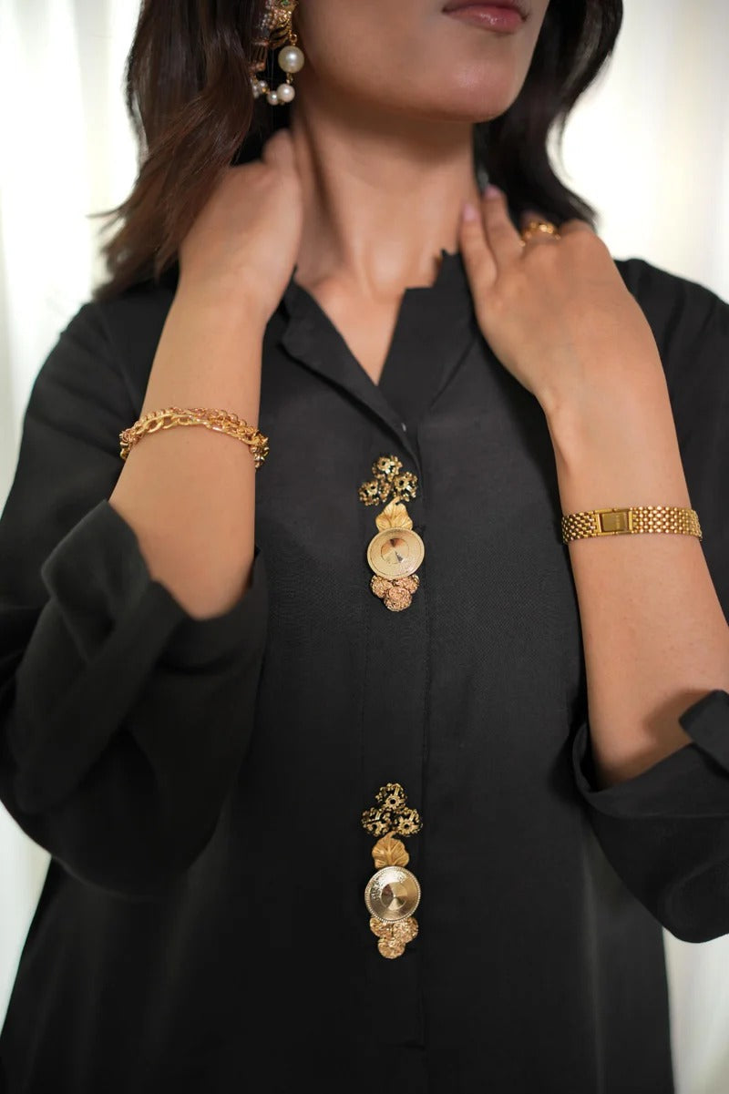The two-piece outfit is crafted from soft loir lawn fabric, offering both comfort and style. The neckline is adorned with a unique bunch of gold buttons.