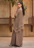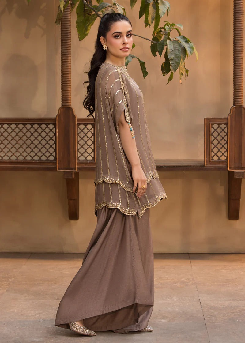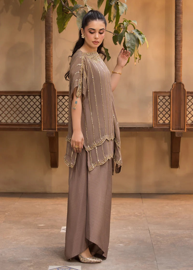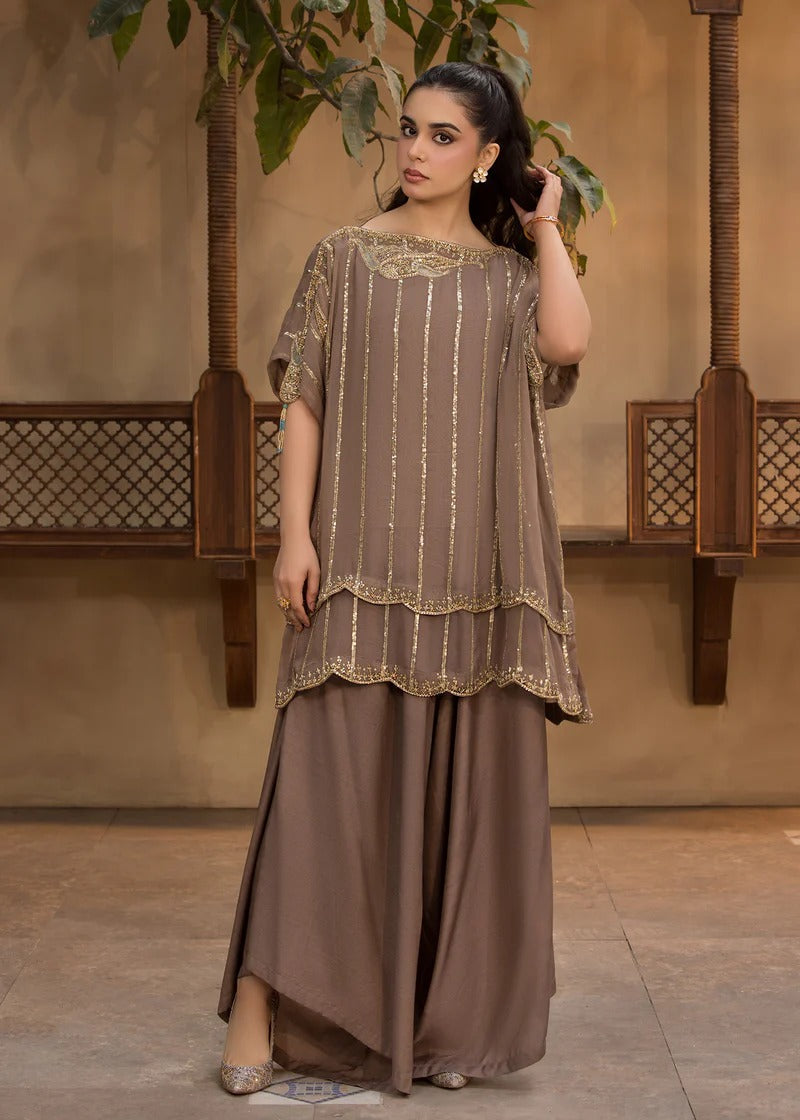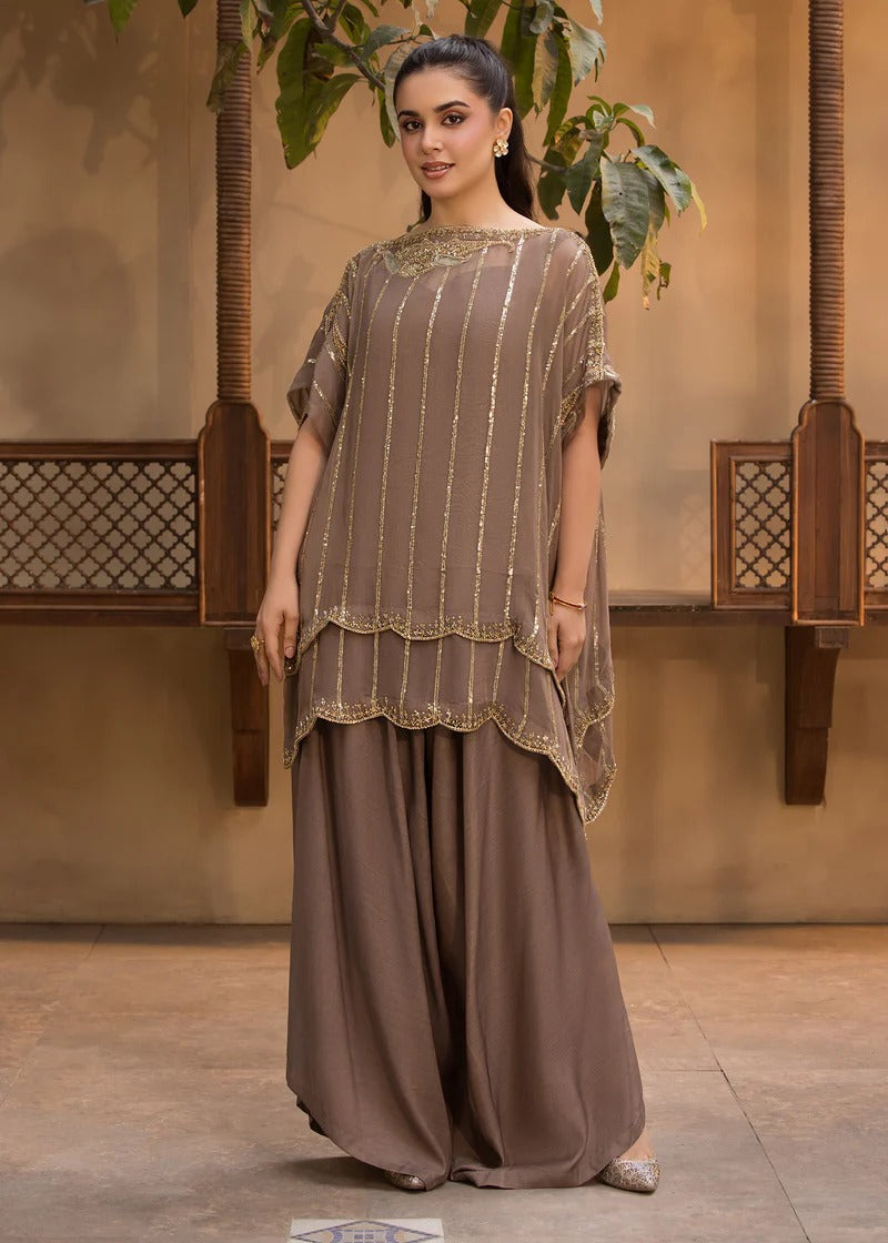 Sequence Chiffon poncho with hand work on neckline and sleeves.and hemline pairred with silk dhaka shlwar.