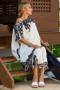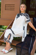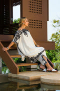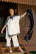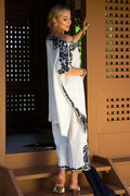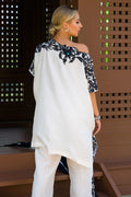 The Kamala suit is a beautiful white suit with black embroidery paired with an organza dupatta. The ari worked cut worked neckline, sleeves, side pocket, and bottom are finished with pearls and feroza, and the asymmetrical loose tunic with Culottes adds a touch of elegance to the overall look.
