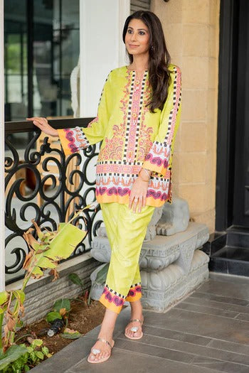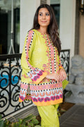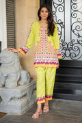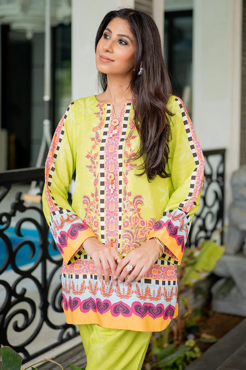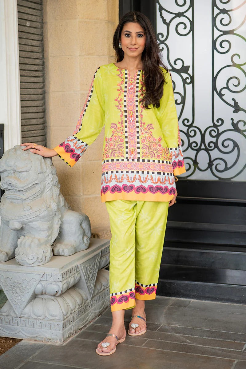 Introducing Kiwi Splash from our Everyday Edit a joyful burst of bold hues and artistic charm. This eye catching ensemble features playful palm tree motifs, dainty pink flowers, and heart prints flowing across our signature short shirt silhouette. Thoughtfully paired with sleek straight pants and finished with delicate resham threaded pearl button detailing, this look strikes the perfect balance between fun and finesse perfect for brightening up your everyday wardrobe. Length of Shirt is 30 inches and pants 36 inches