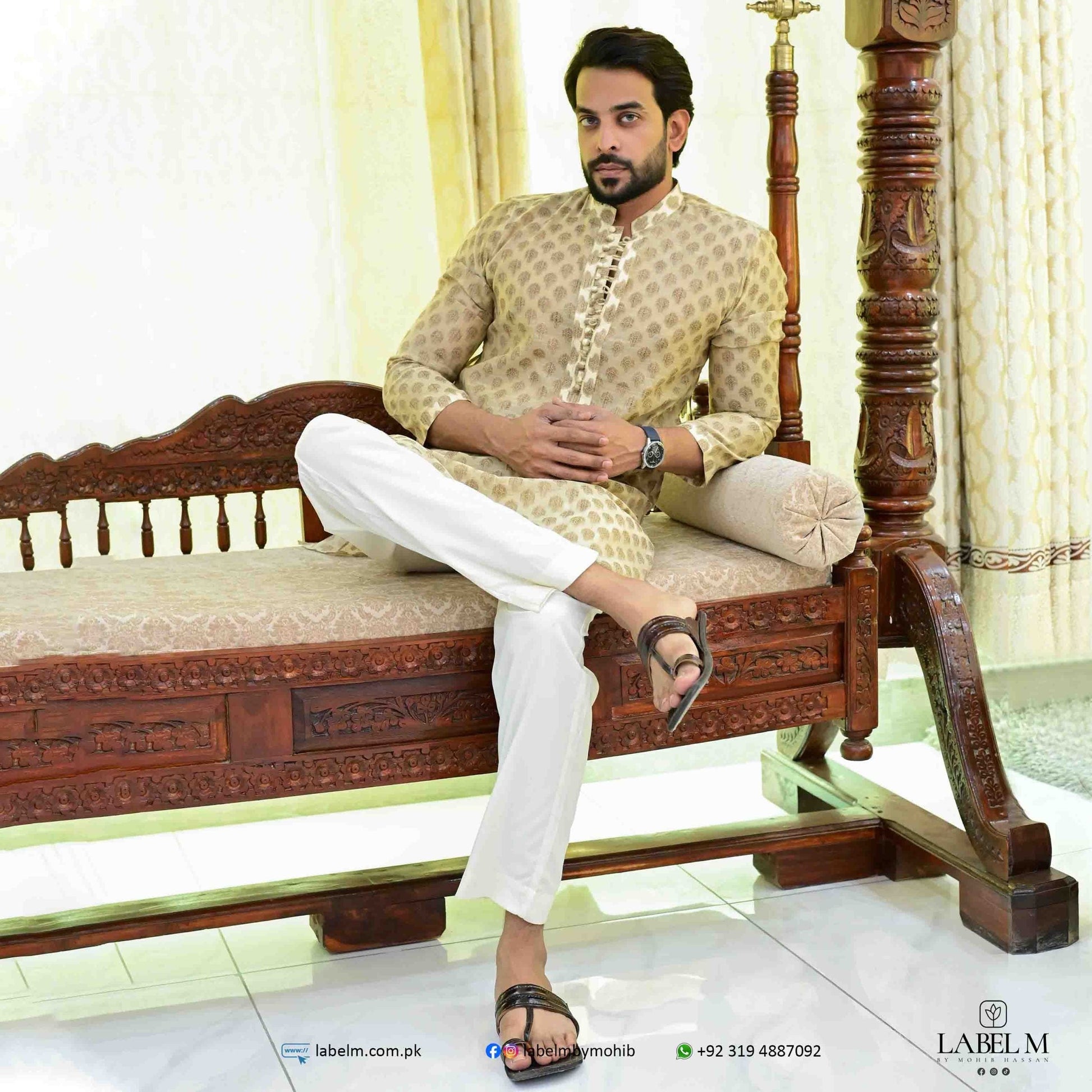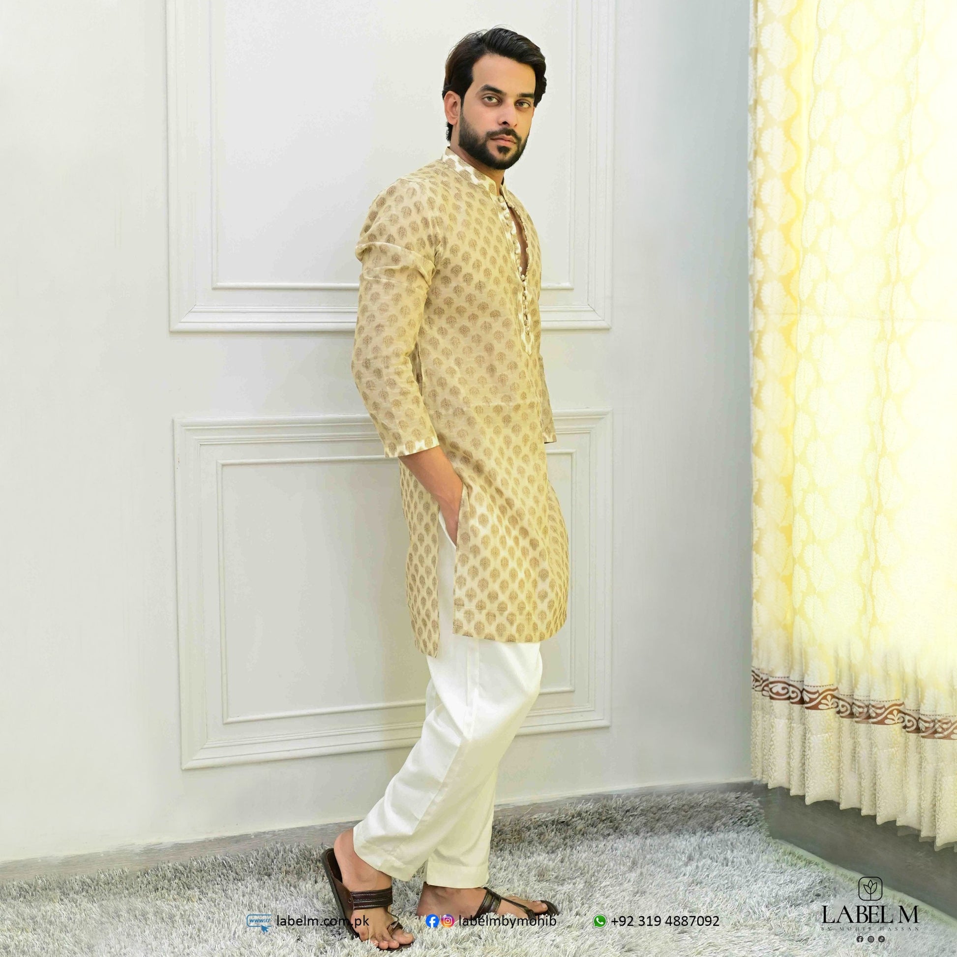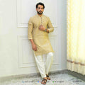 This light fawn stepler cotton kurta features a self-print design that adds a subtle elegance to your wardrobe.