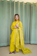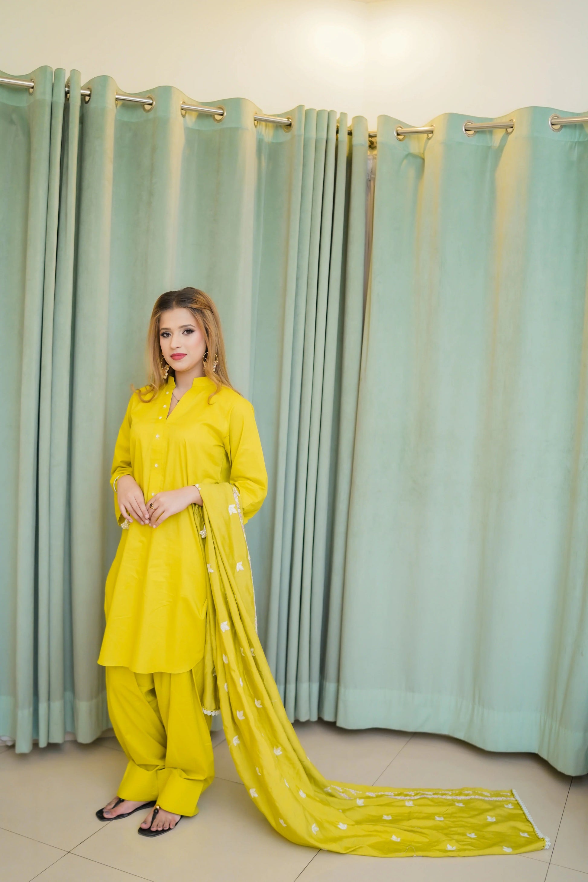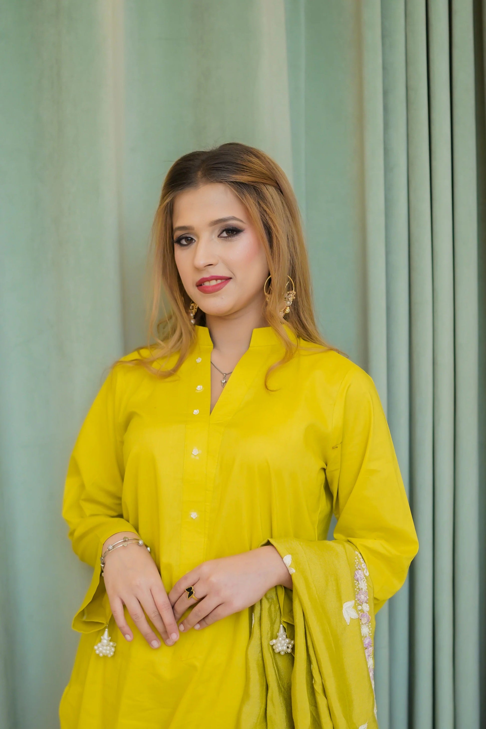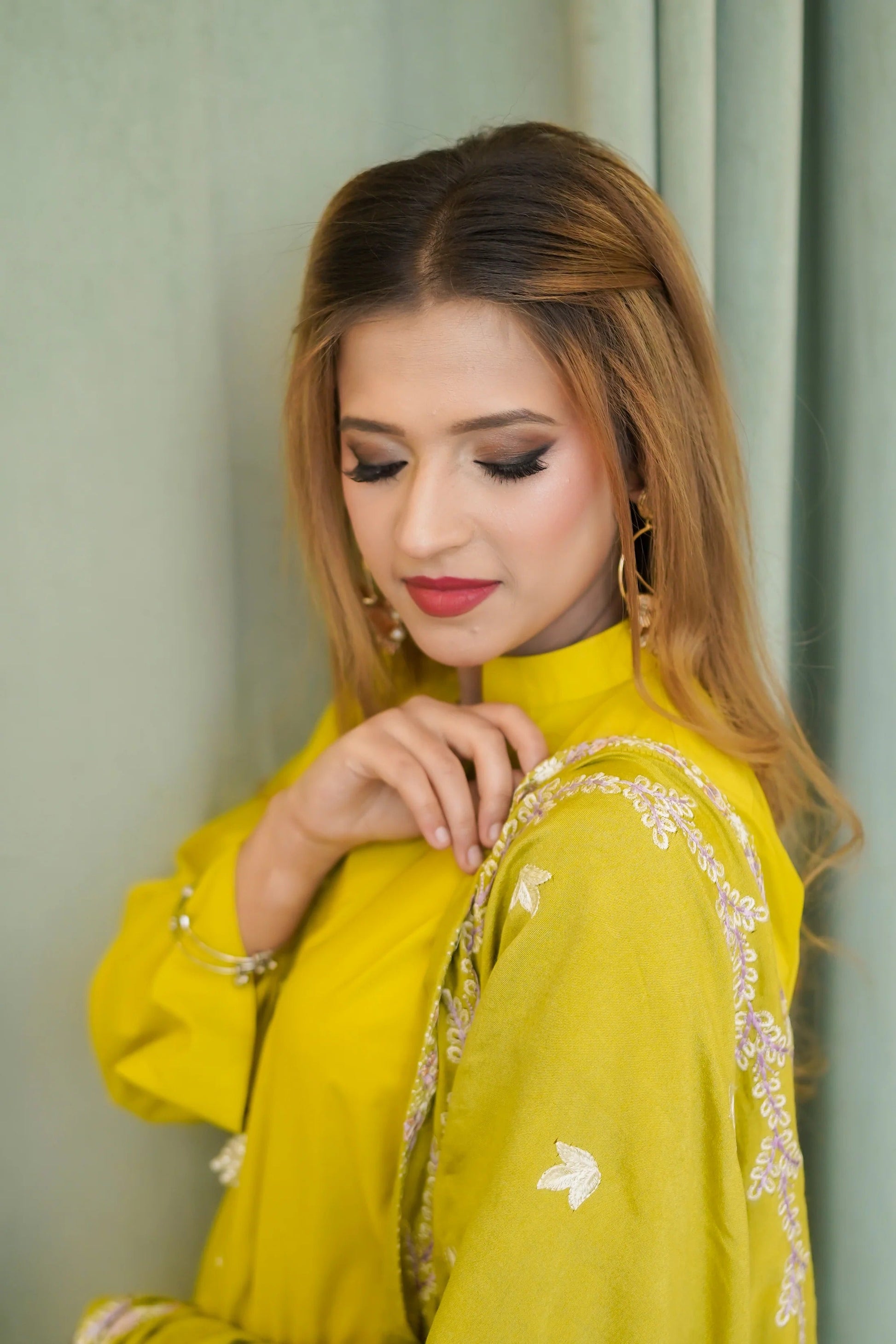 A flowing lime green dress, the color of a lush forest, with delicate embroidery that whispers tales of ancient crafts. The dress itself could be a simple yet elegant silhouette, or perhaps a more dramatic design with flowing layers.