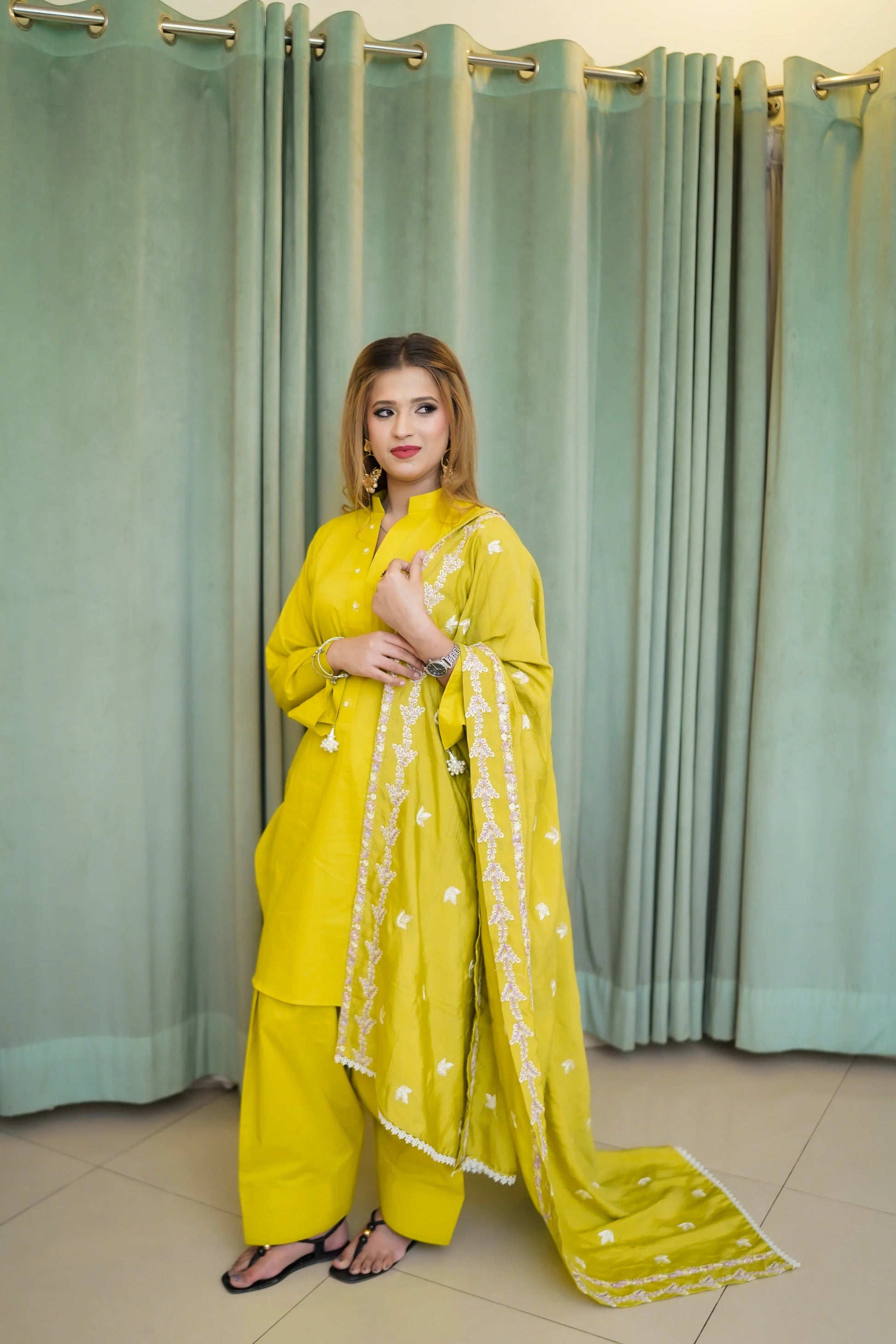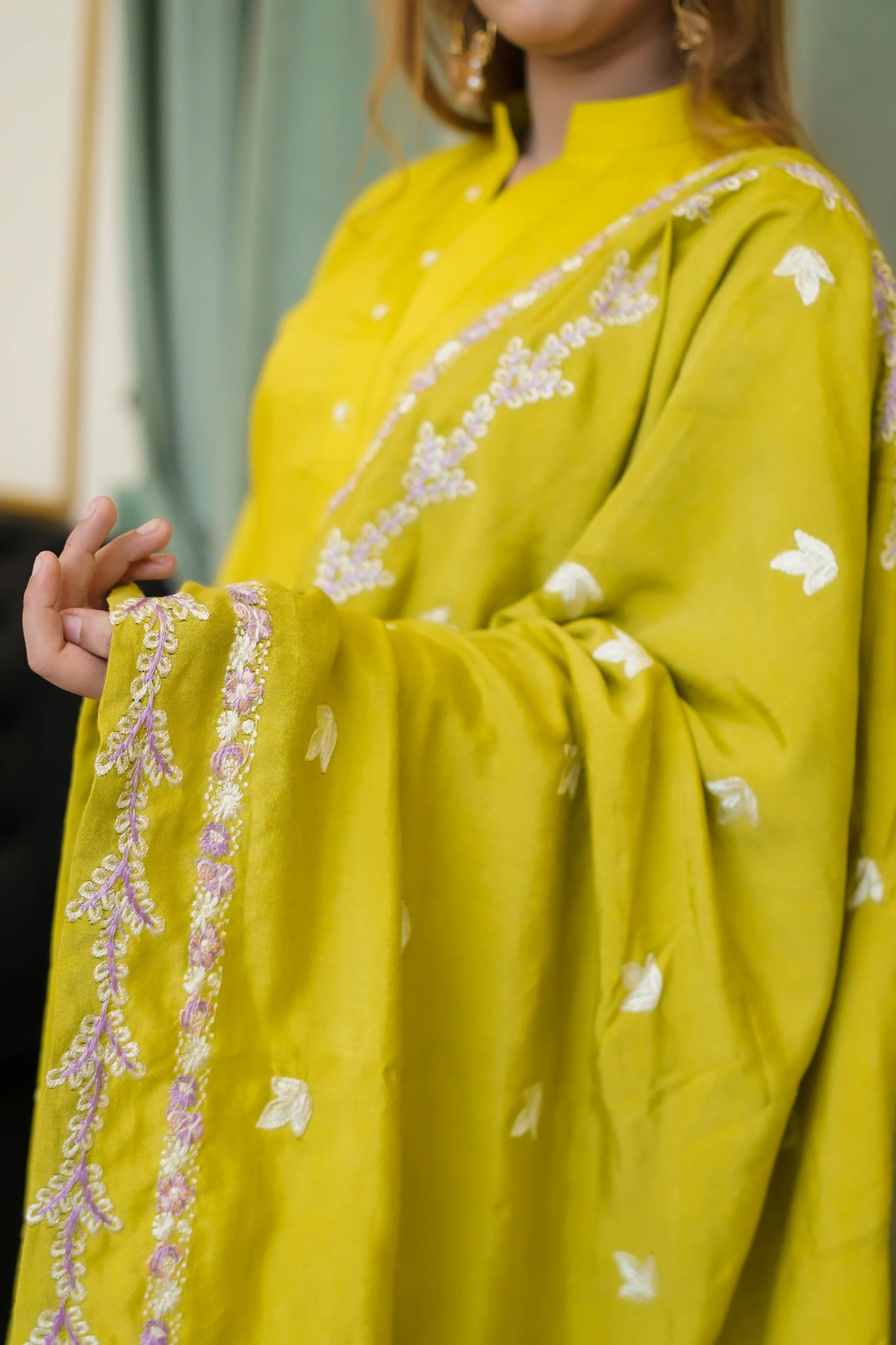The embroidered shawl is the star of the show. It's draped over the shoulders, adding a touch of warmth and a burst of intricate artistry.