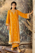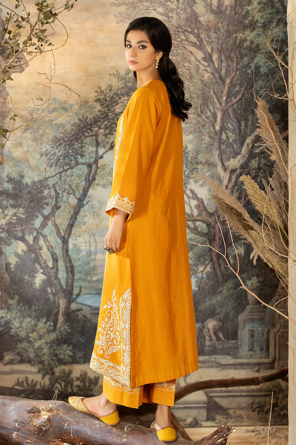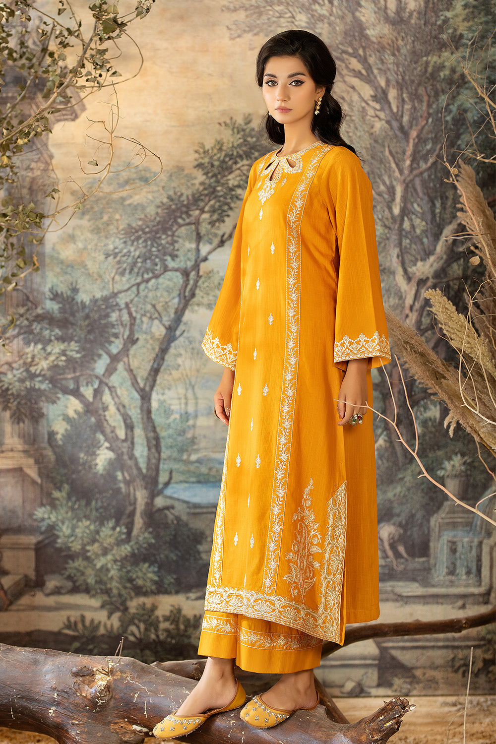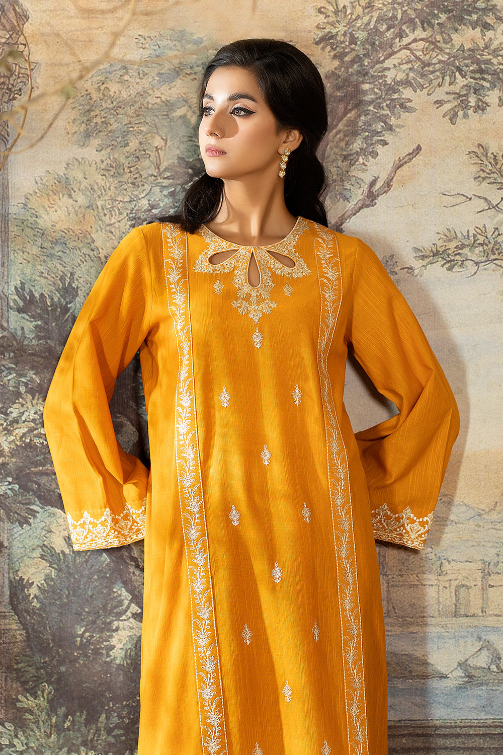 Mustard khaddar 2-piece suit, showcasing embroidered panels and intricate paisley motifs. The ensemble is elevated with an embroidered keyhole neckline, adding touch of elegance to the stylish outfit.
