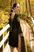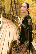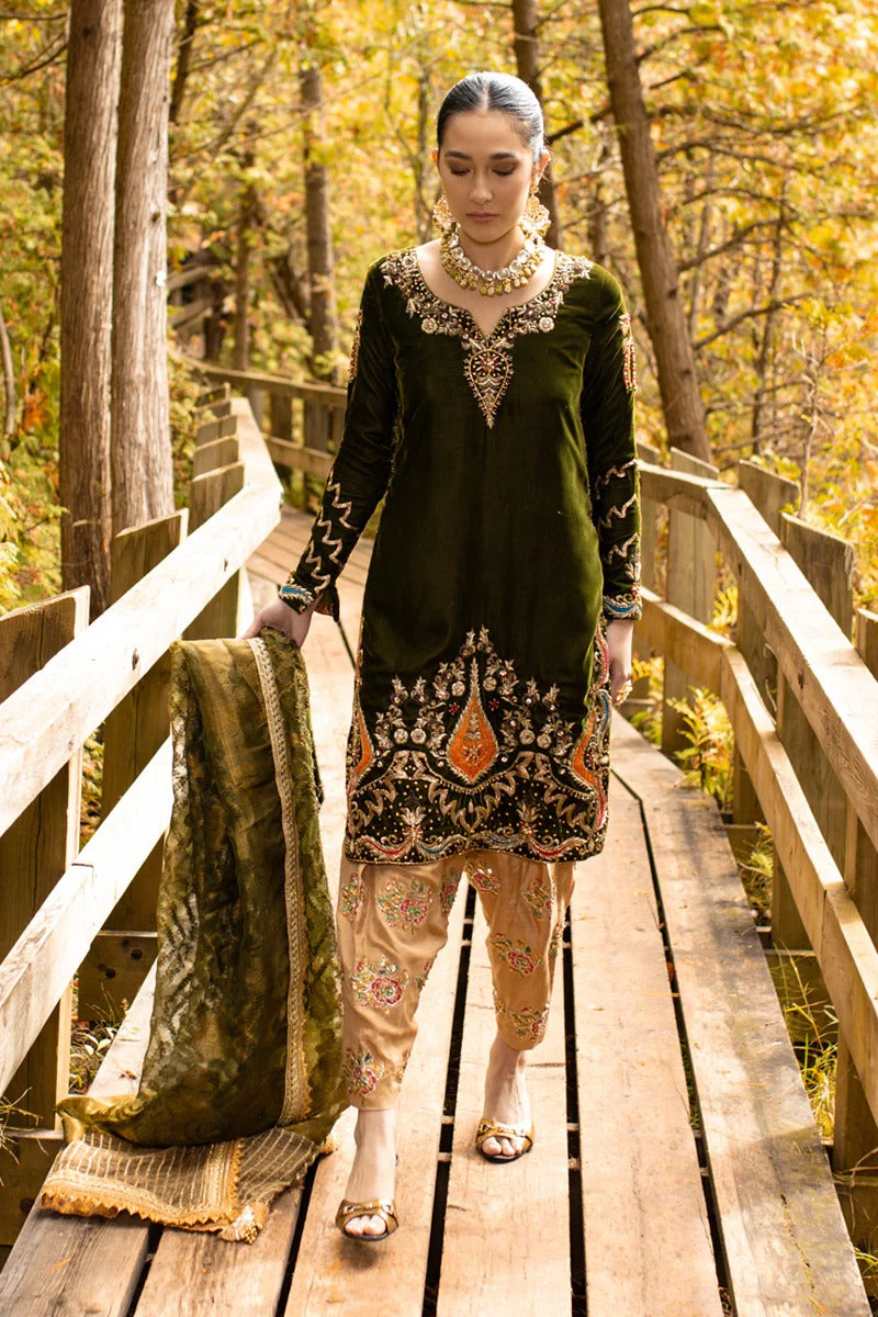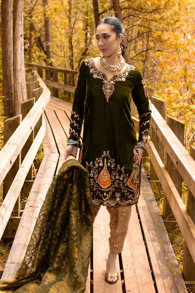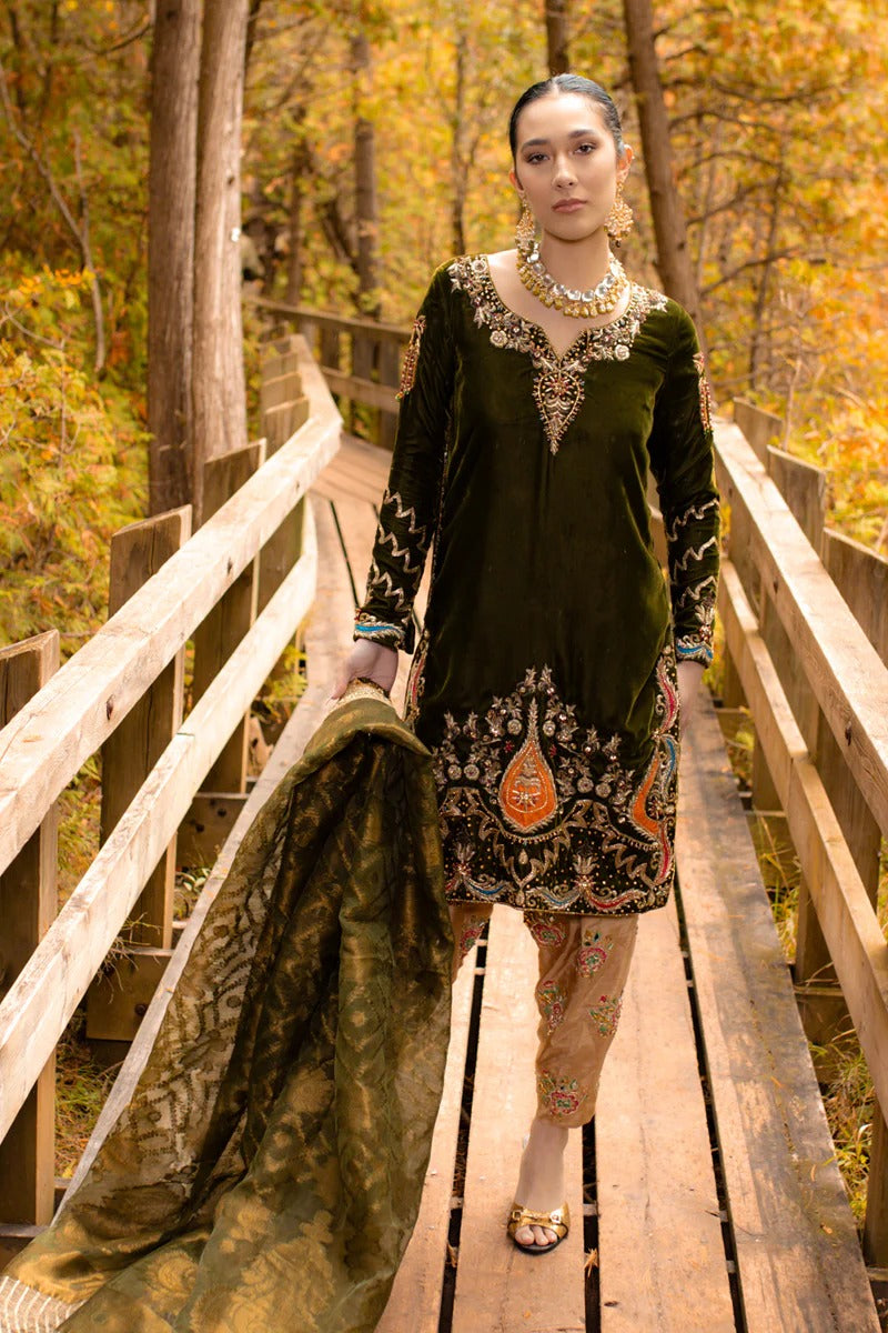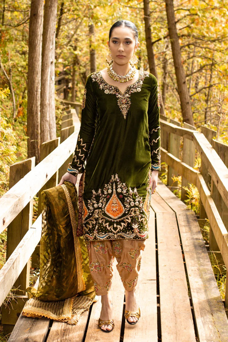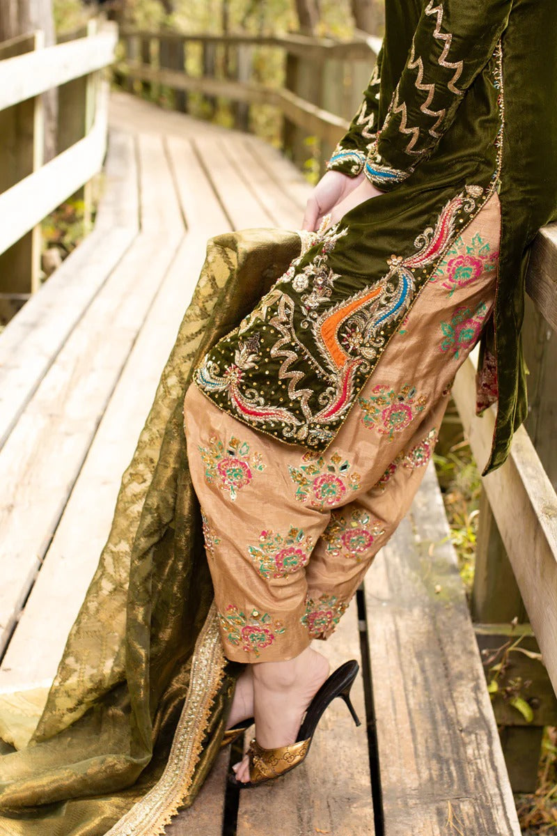 Introducing "Marjan" in a rich olive green hue. This traditional shalwar suit exudes timeless elegance. The velvet shirt is exquisitely adorned with intricate nakshi dabka and multi-colored applique work on the neckline, sleeves, and hemline. Paired with an embellished raw silk shalwar and jamawar organza dopata. Marjan is a perfect fusion of traditional and contemporary styles, making it a stunning choice for any special occasion.