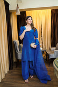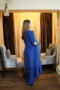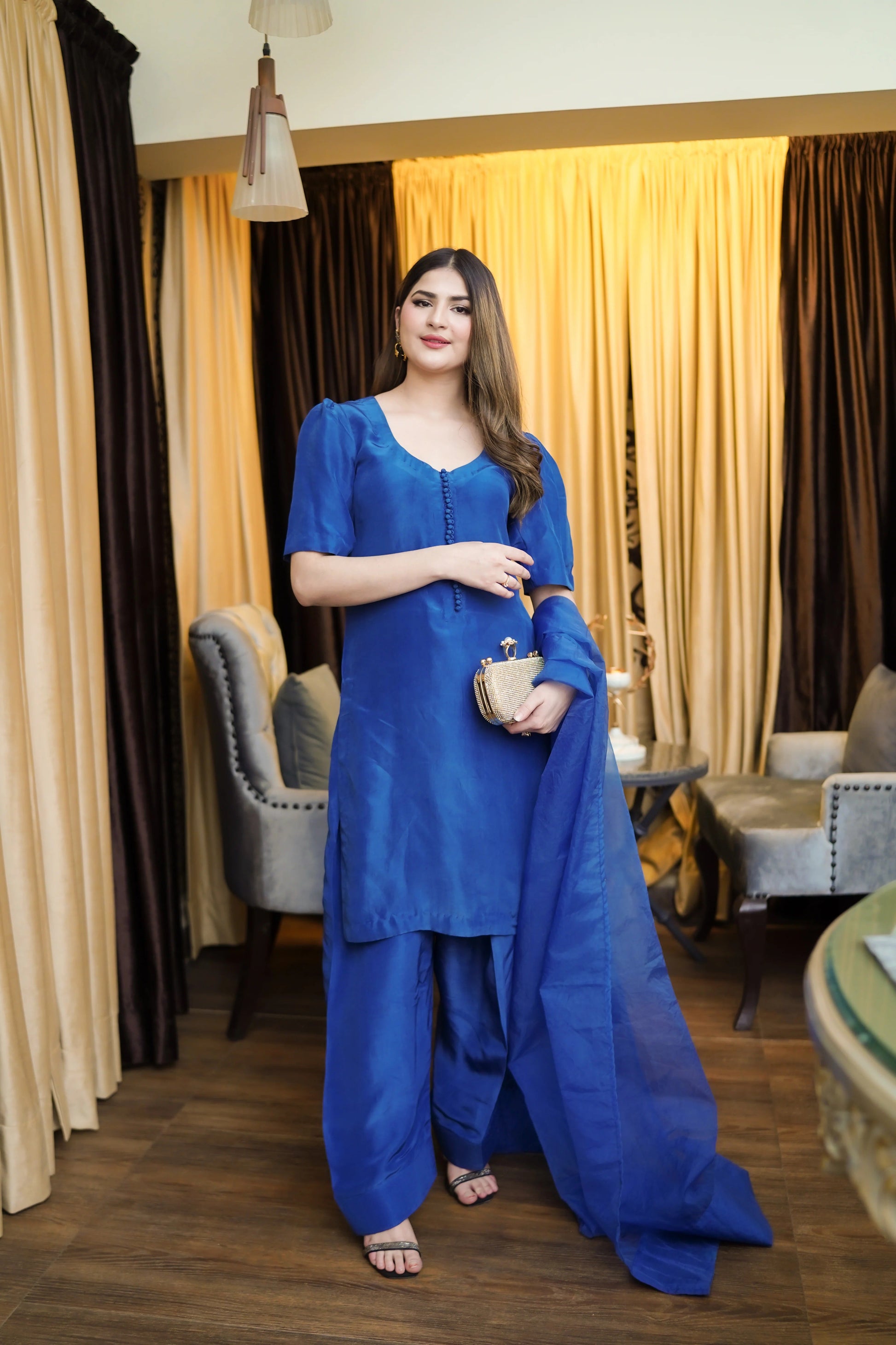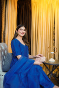 Embrace the calming elegance of teal blue with this stunning outfit. The vibrant yet soothing hue evokes a sense of tranquility and sophistication.