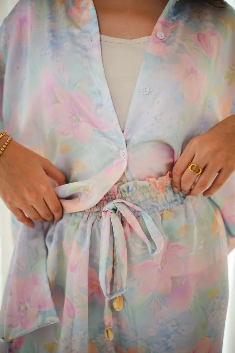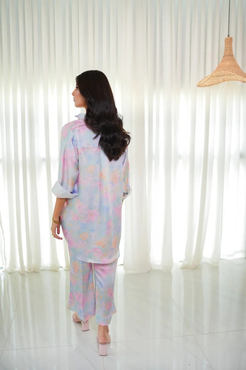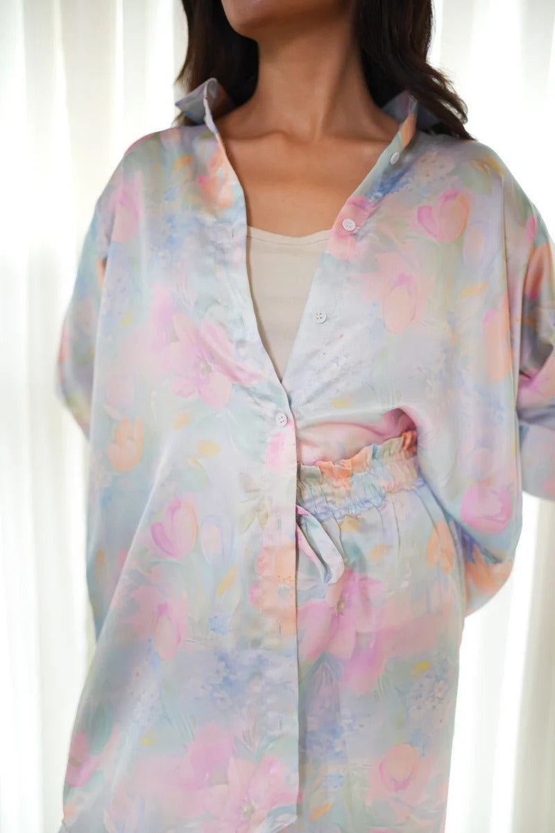 Step into refined elegance with our florence silk matching cord set in a dreamy pastel floral print. The button-down shirt exudes sophistication with its smooth, flowy silhouette, while the straight-cut trousers provide a sleek and comfortable fit