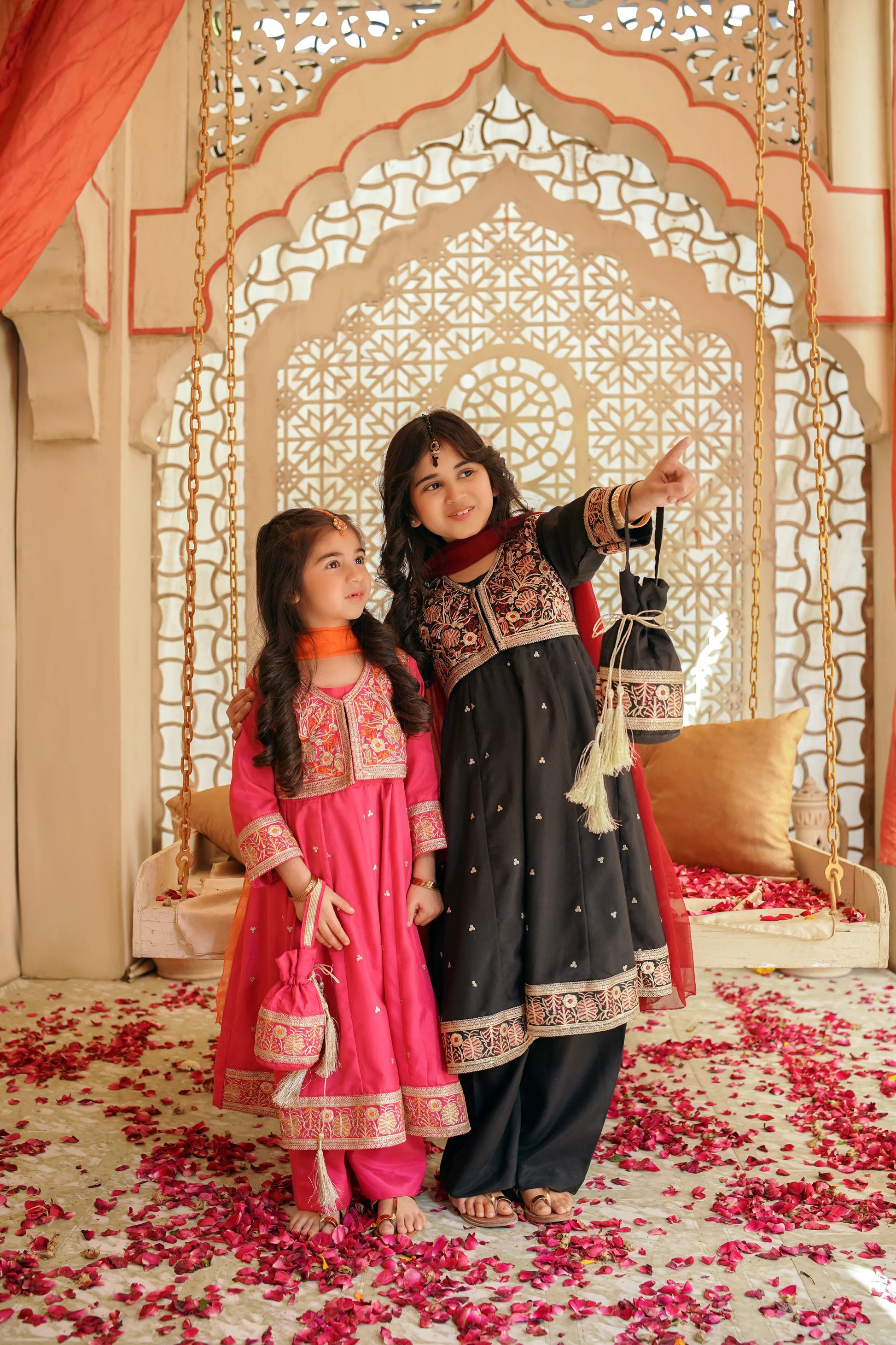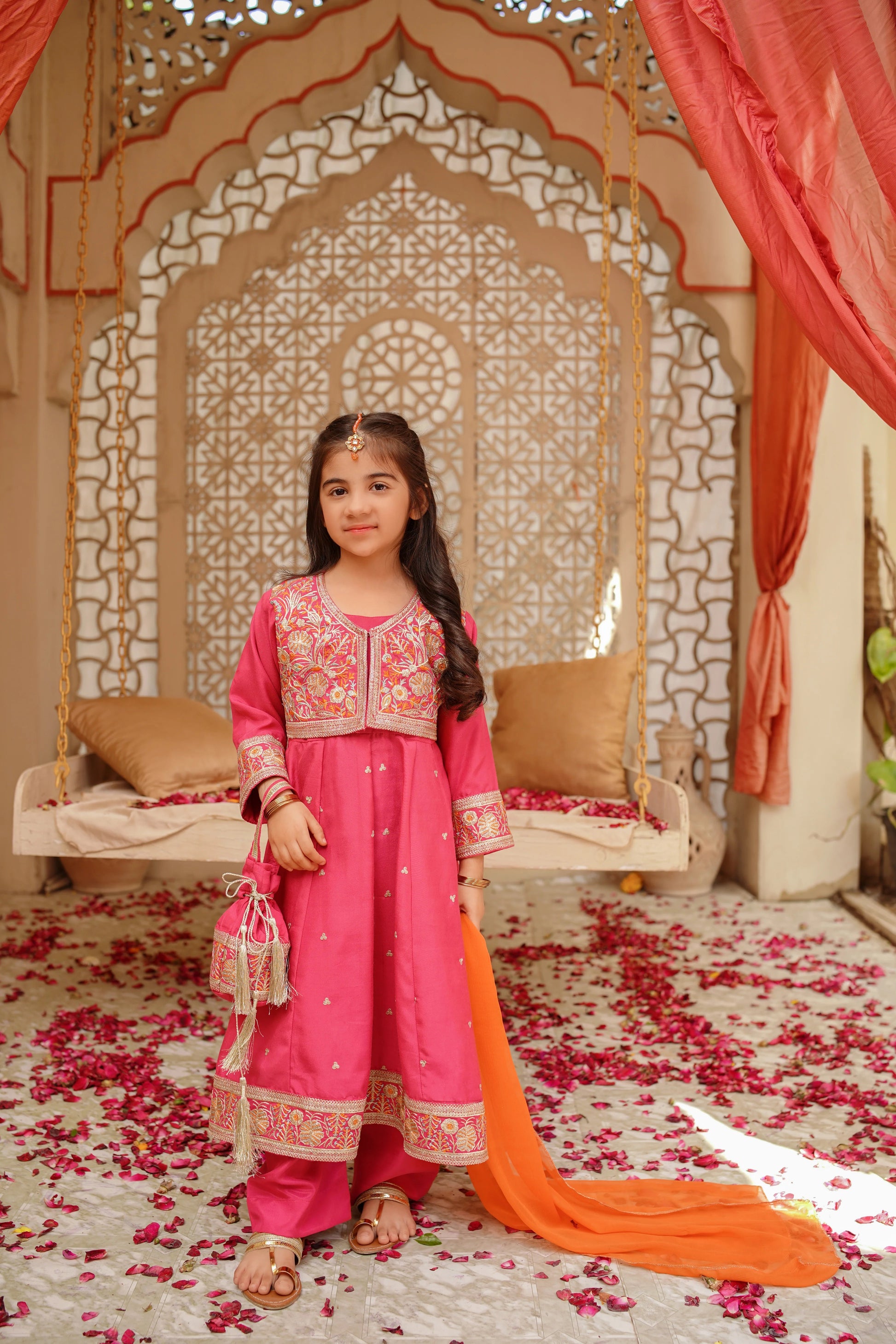 Golden and Maroon khaadi net culottes set with intricate zarri and sequence embroidery and net dupatta.