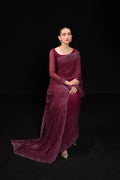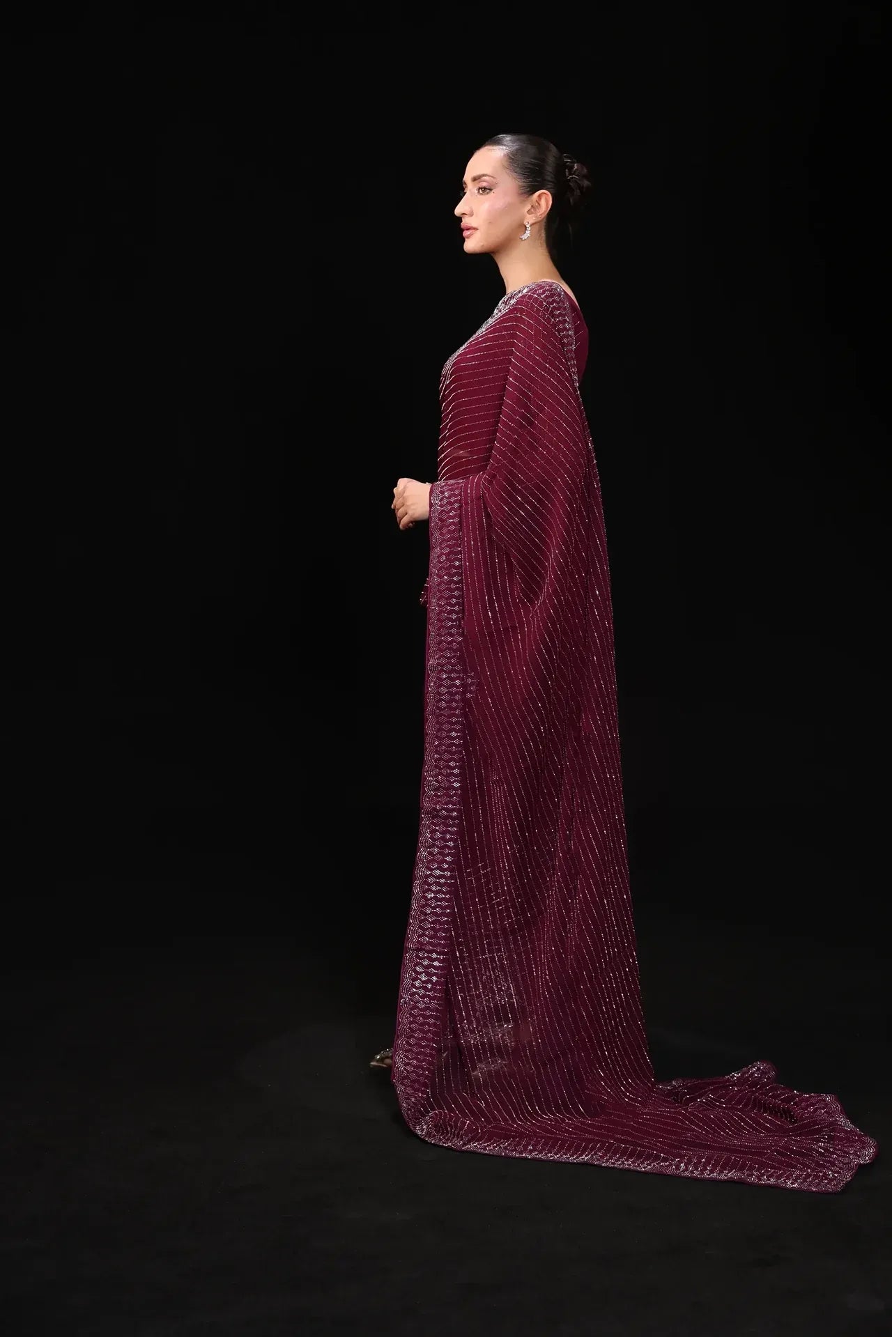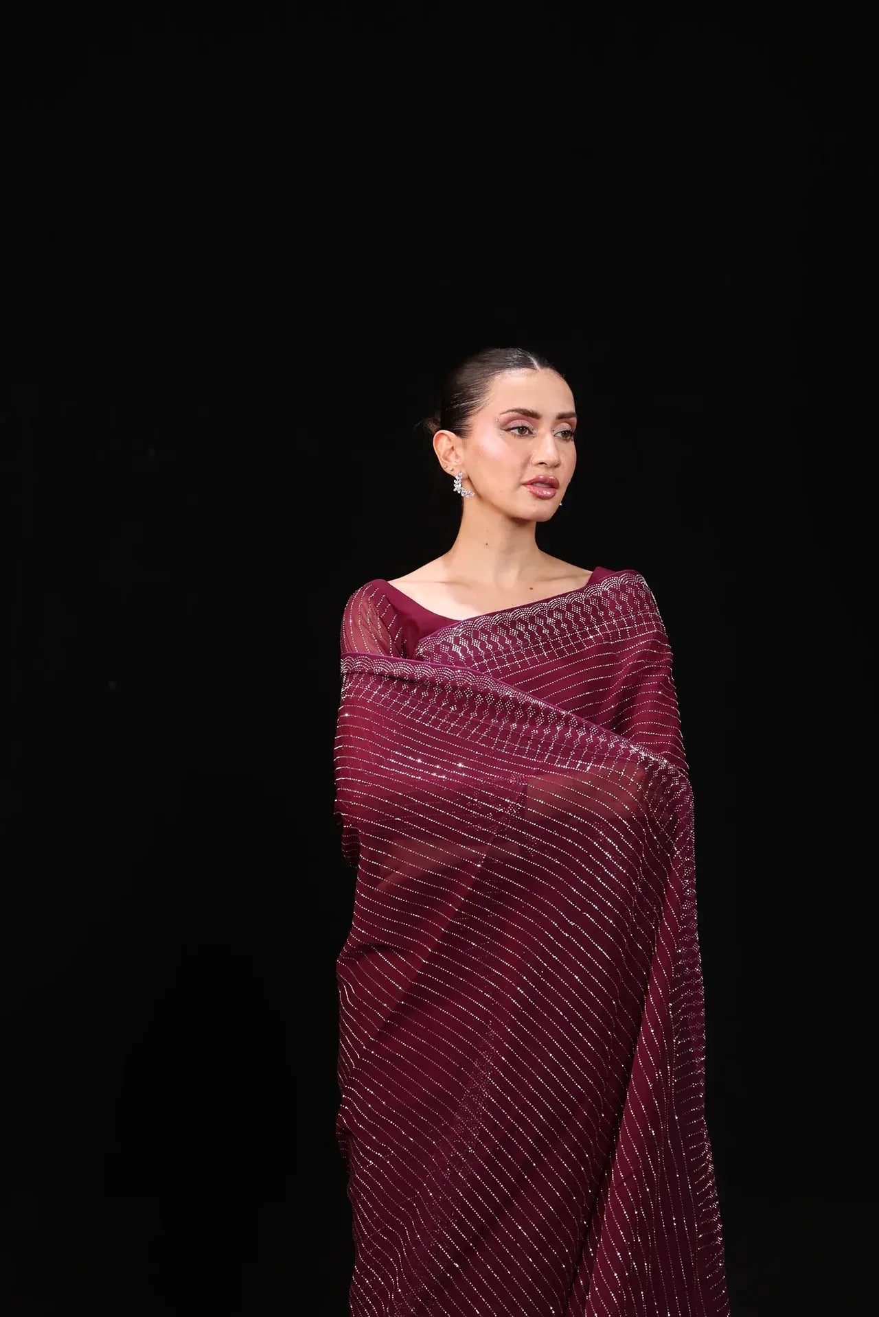 Plum Reverie captures the essence of dreamy sophistication. Cloaked in a rich, royal plum hue, the saree shimmers under light thanks to intricate rhinestone detailing. Its blouse is designed with a refined back cut, marrying modern sensuality with timeless elegance.