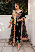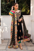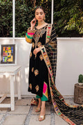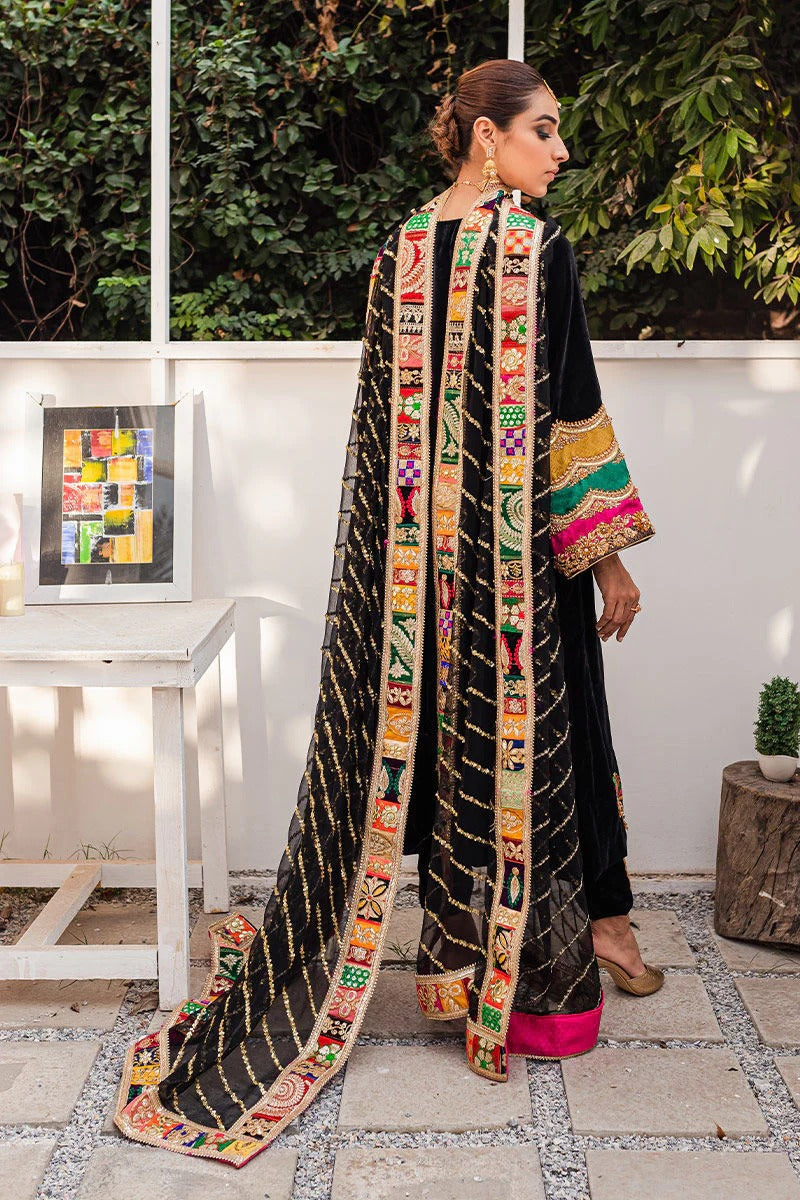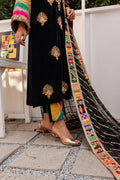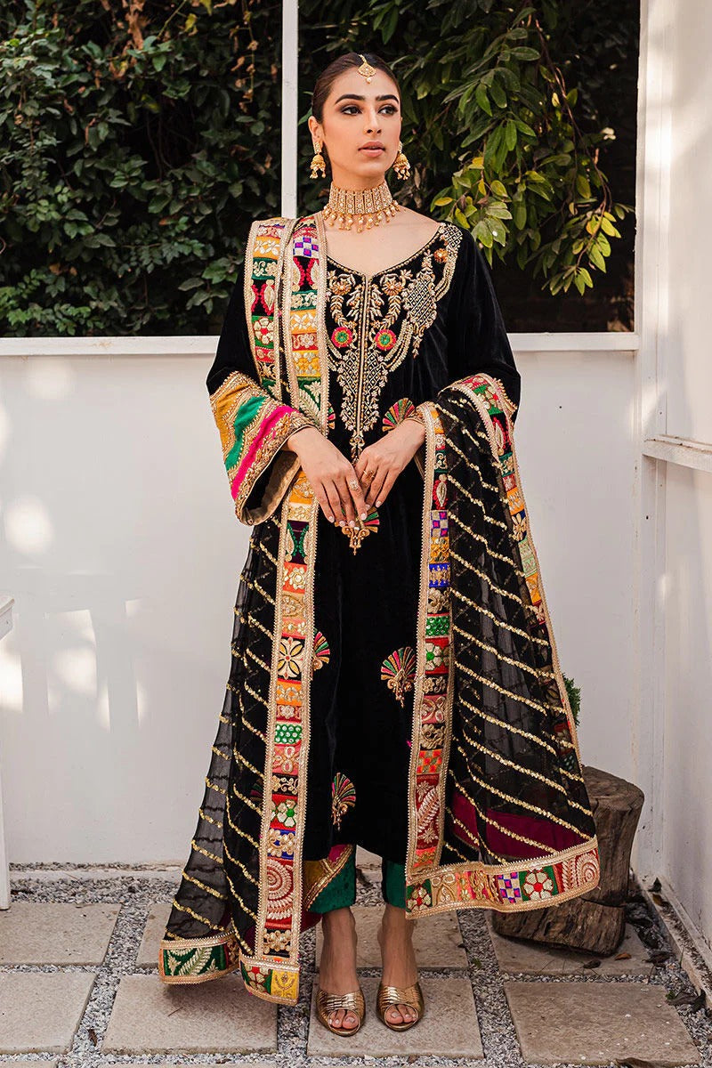 Traditional long shirt with zari and multi-colored resham work on the front with chatapatti embellished sleeves. Paired with chatapatti pants and a black sequenced dupatta beautifully adorned with a chatapatti border.