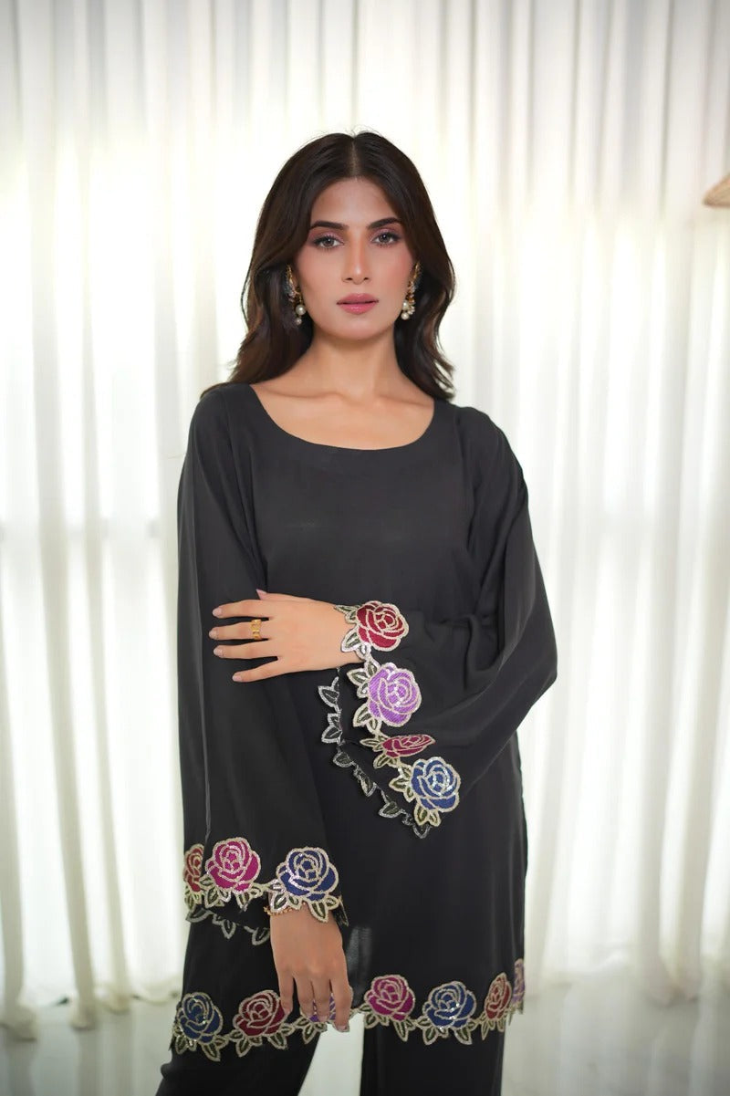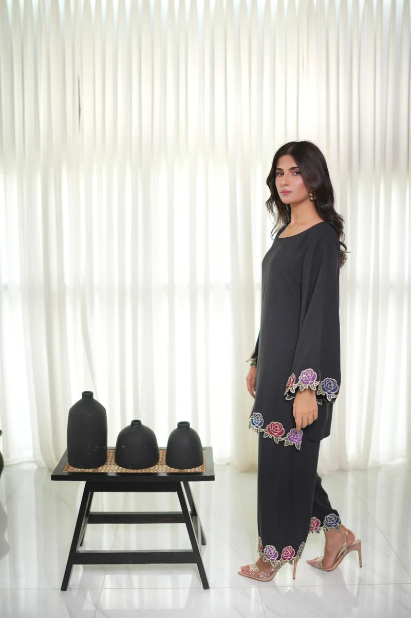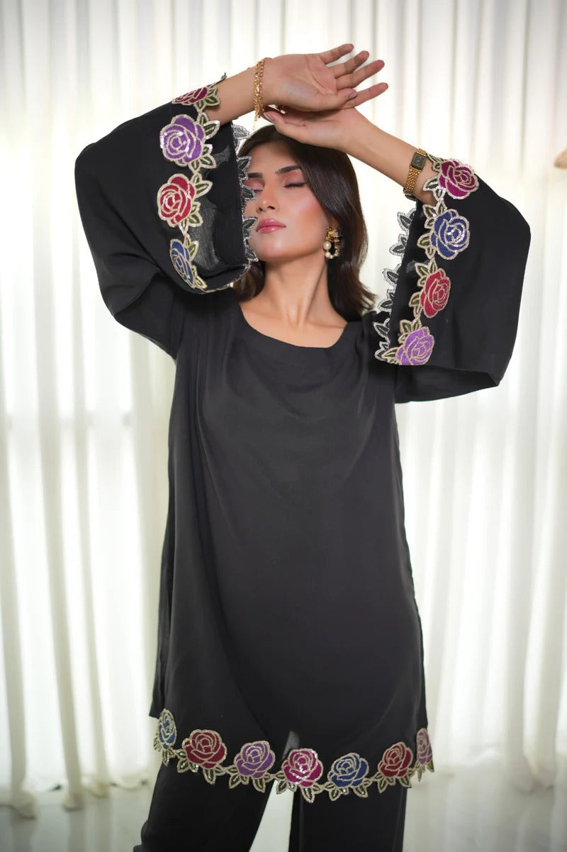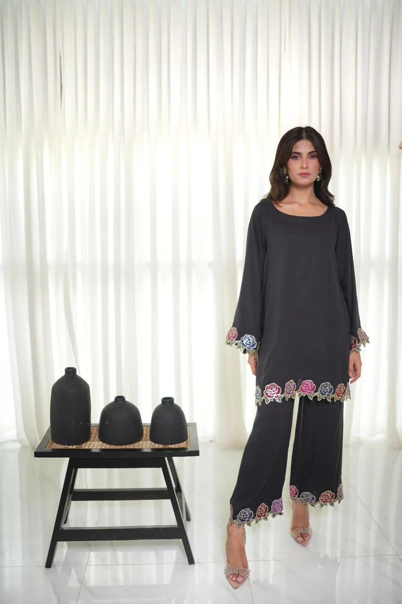 This elegant black 2-piece cord set is made from loir lawn fabric and features exquisite rose thread and sequin embroidery on the sleeves and hem. The embroidered culotte completes this stylish look.