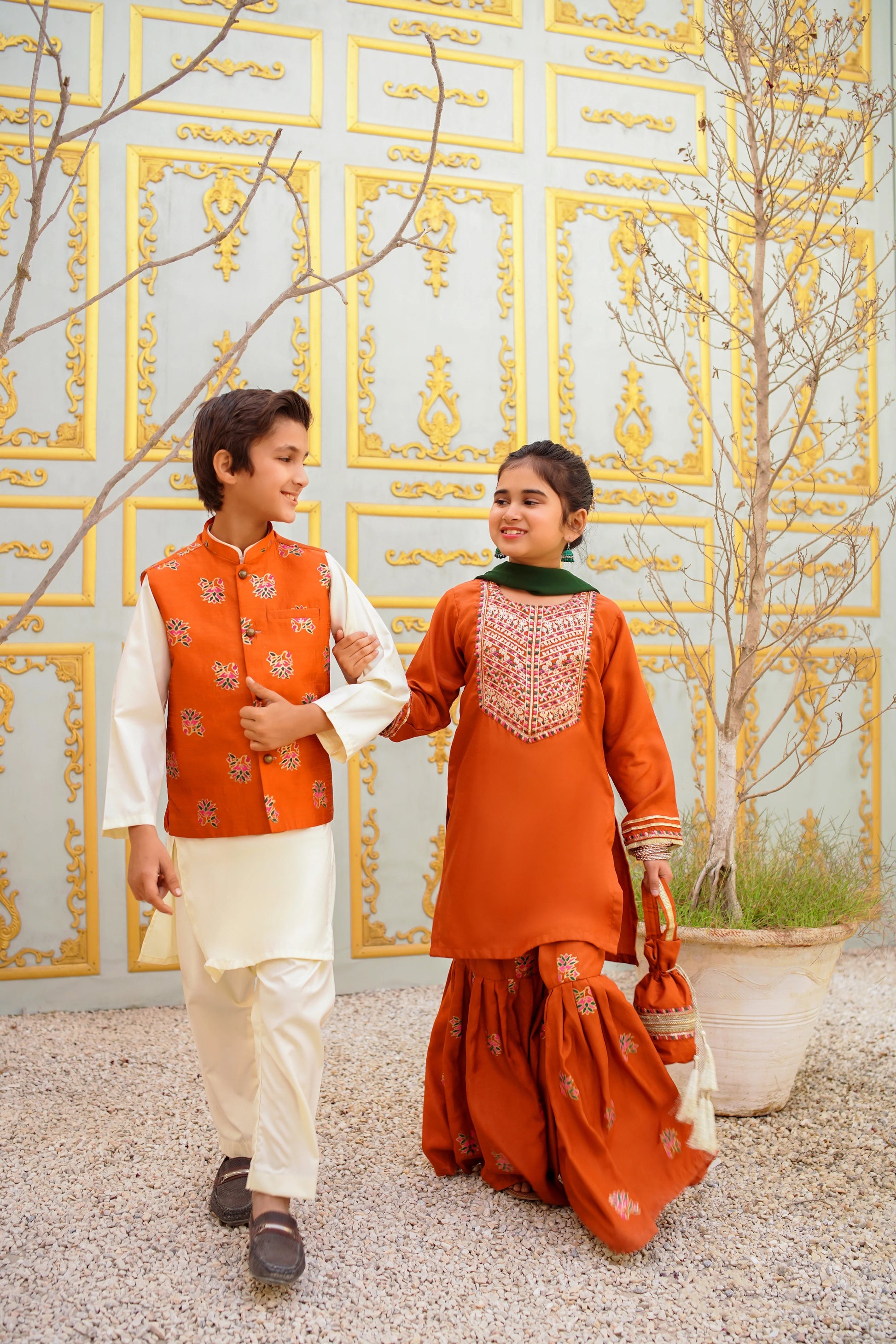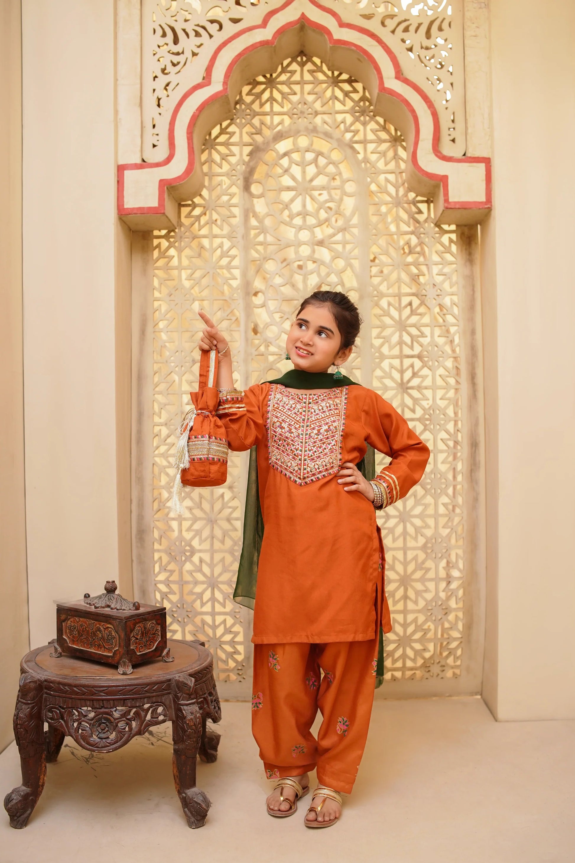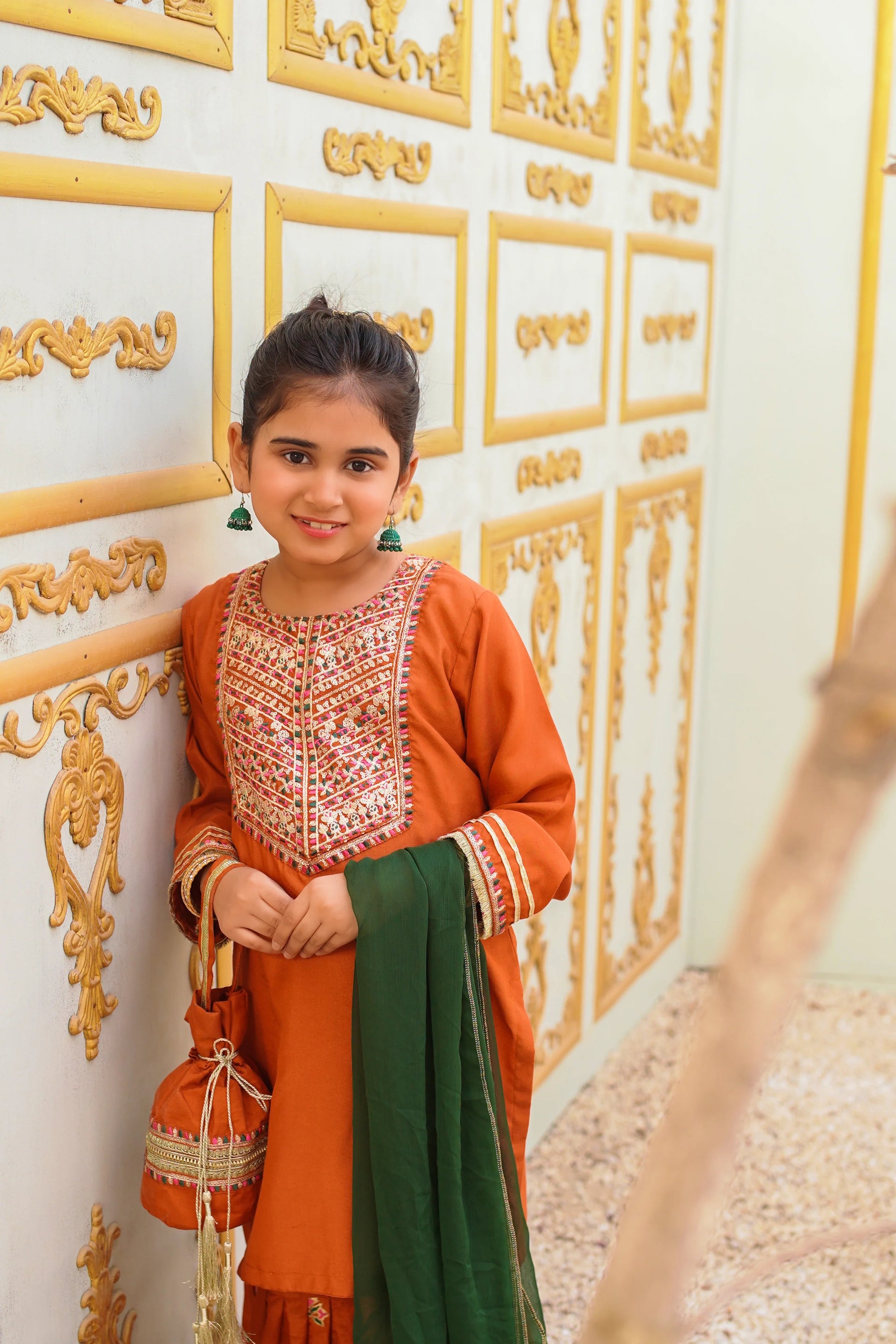 Rust and green viscose gharara set with intricate embroidery and block printed gharara paired with green chiffon dupatta.