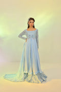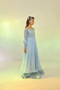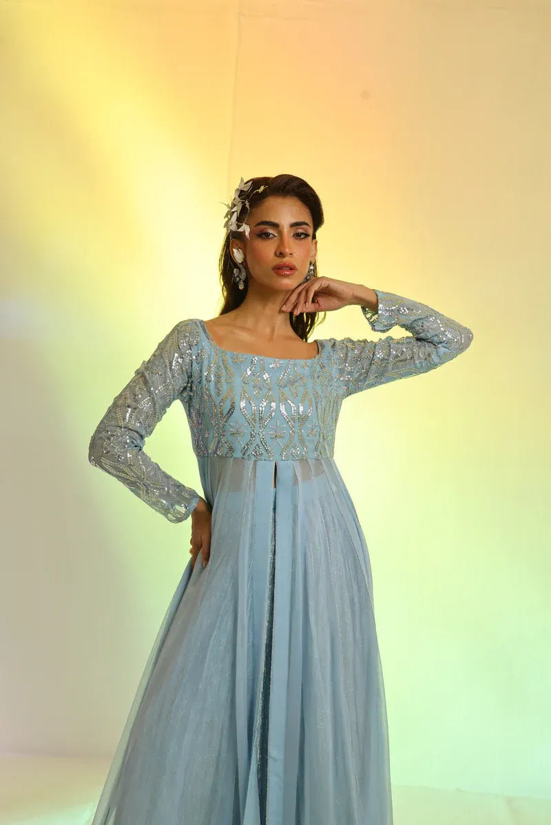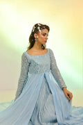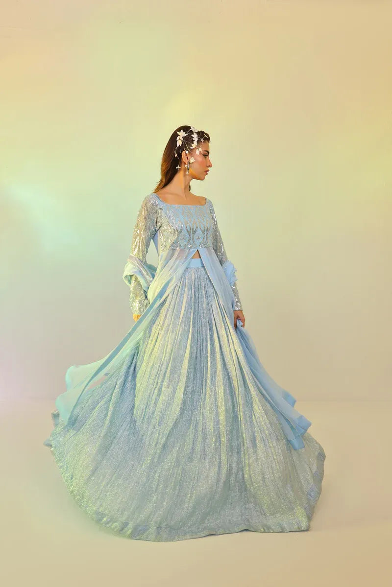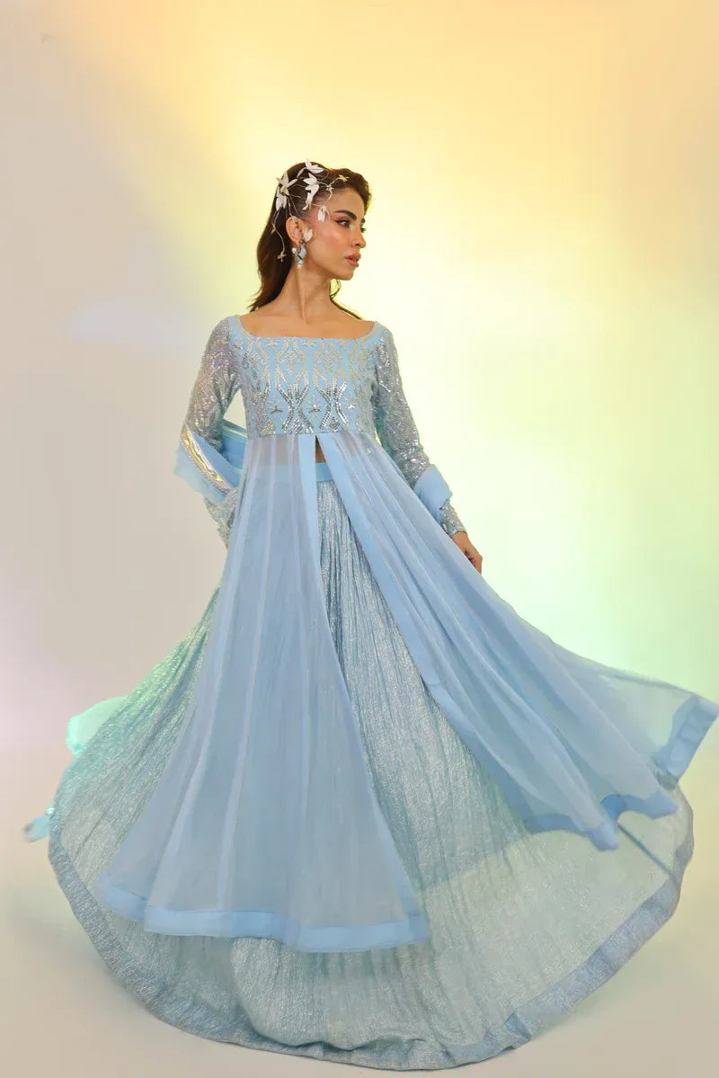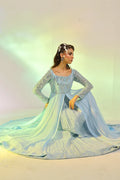 This luxurious 3-piece ice blue set features a stunning kalidaar pishwas, paired with a voluminous shimmer chiffon lehenga that is designed with over 15 yards of fabric, creating an incredible flare that enhances the grandeur of the ensemble.. The body of the pishwas is intricately embroidered with silver sequins, while the kalis are detailed with silver charma, adding a unique flair.
