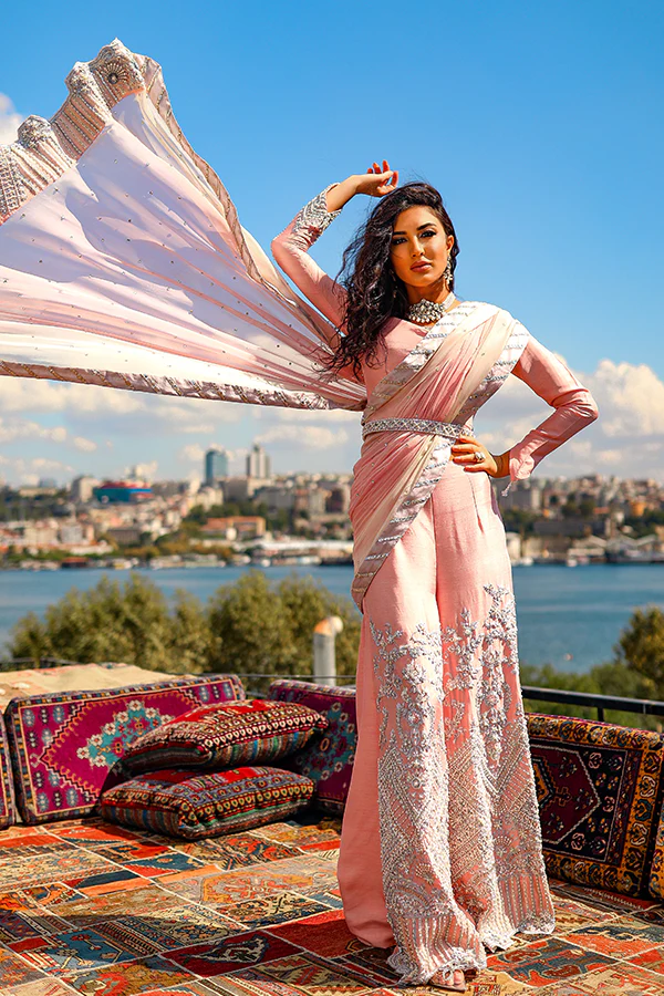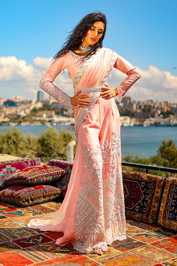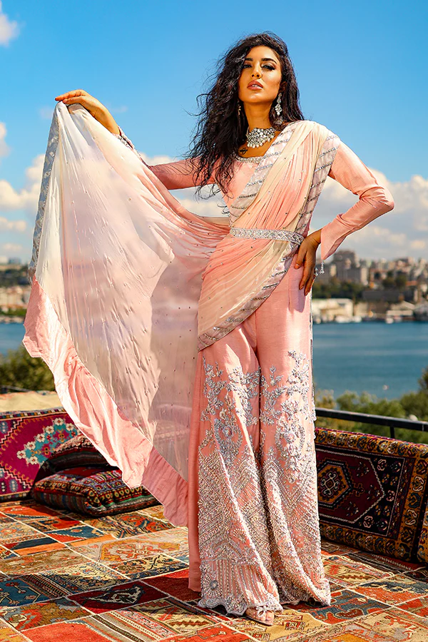 Tatlim is a dreamy peach ombré chiffon saree paired with fully embellished raw silk sharara pants. The meticulous details using silver beads, sequence, tilla, and pearls over the sleeves, blouse, and belt showcase a perfect pastel festive outlook.