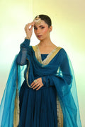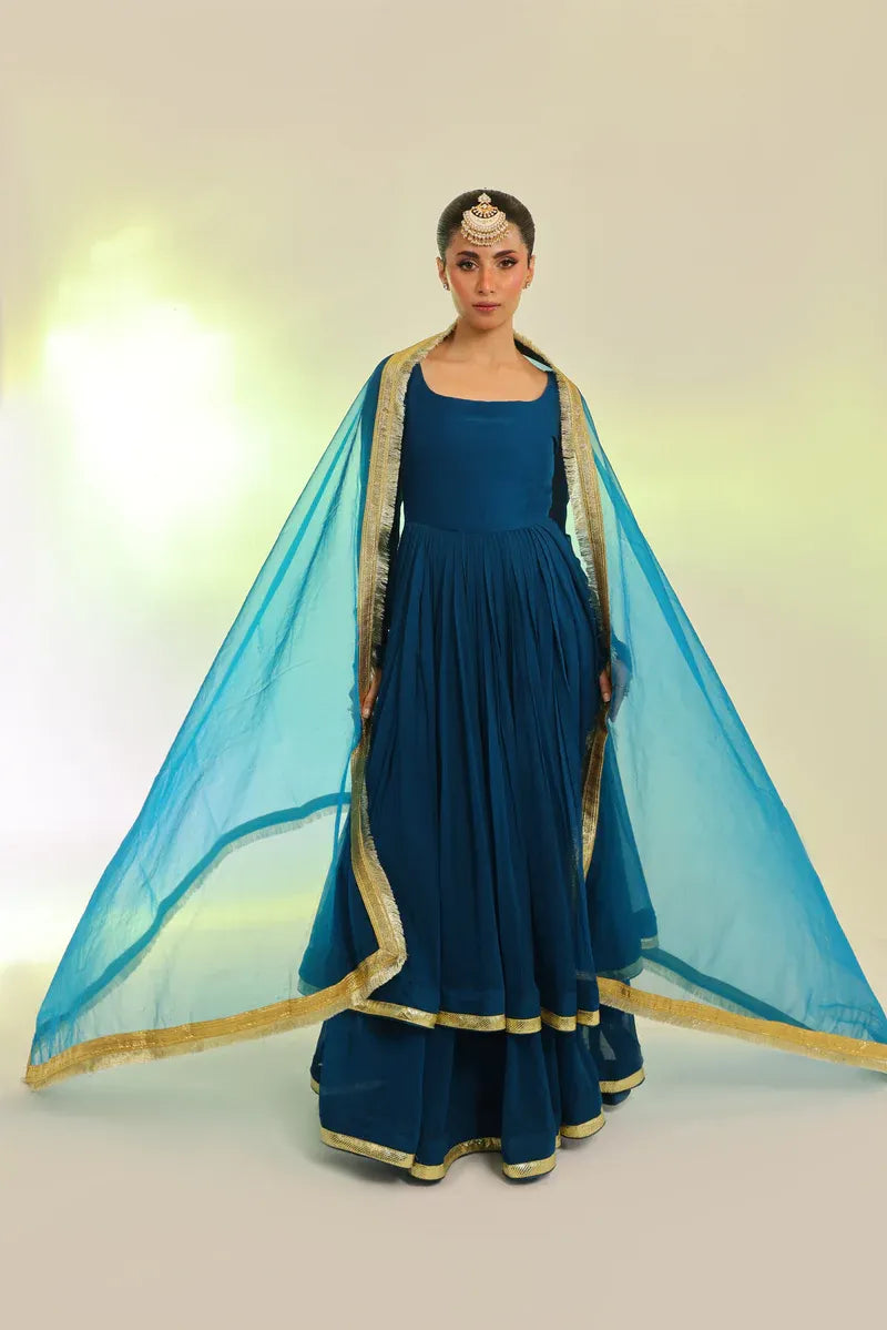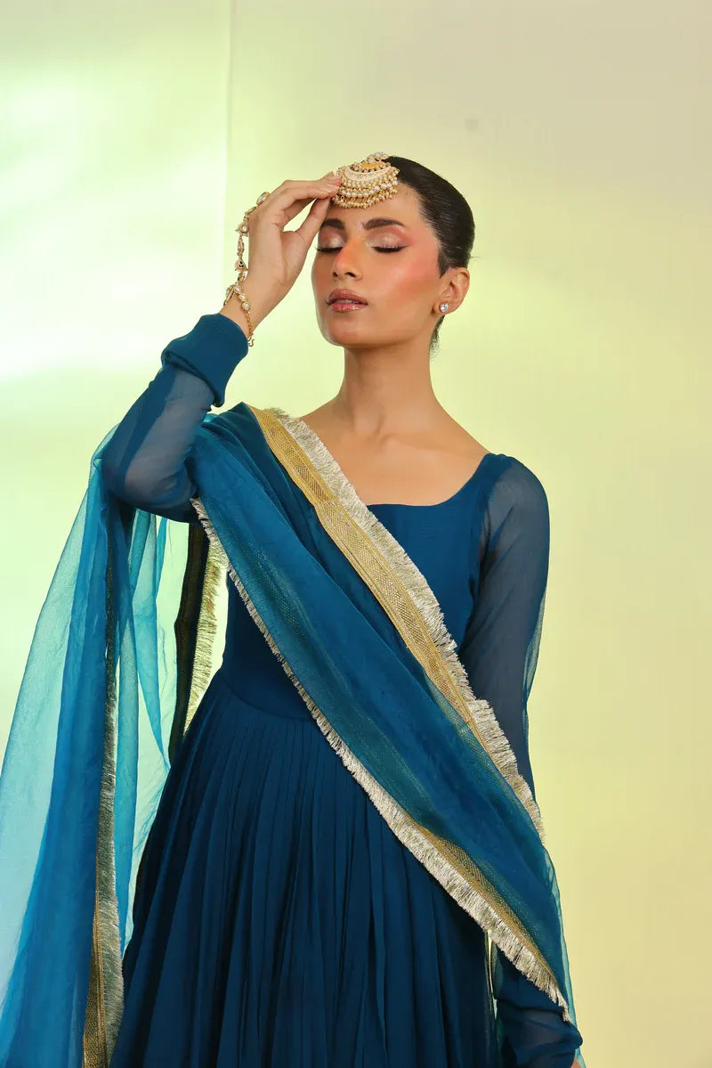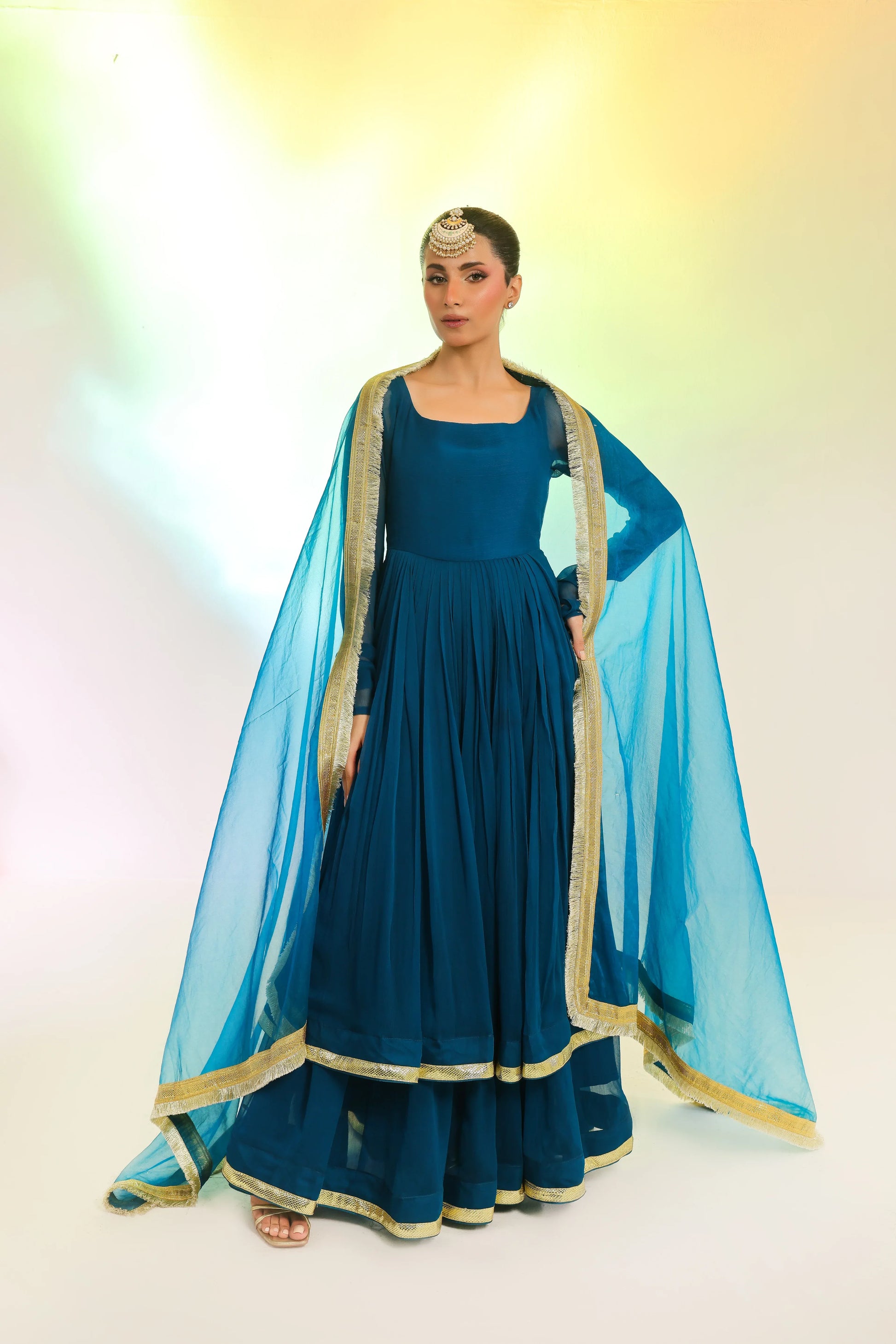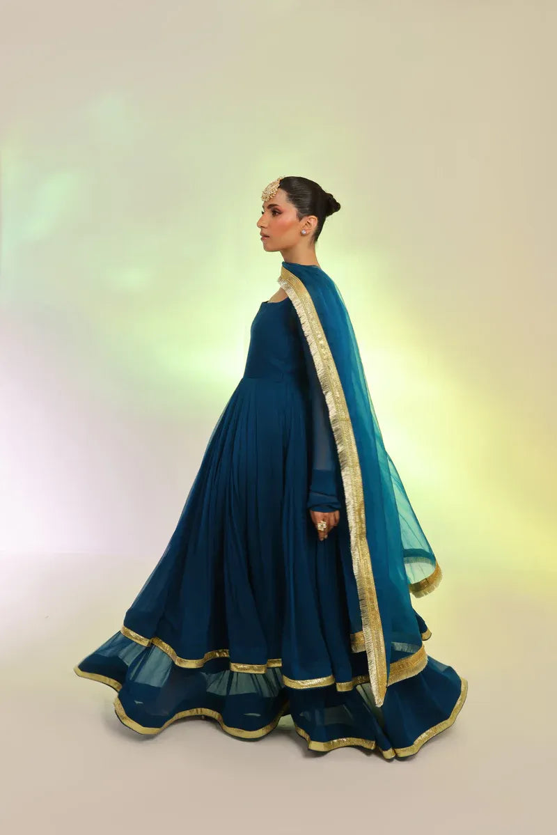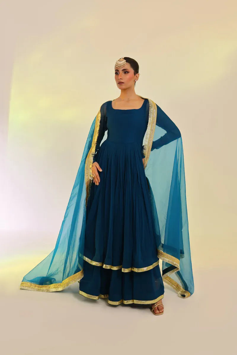 This Flowy set features a crinkle chiffon frock with a remarkable two-tier design that creates an incredible 350+ inches of flare, made with over 20 yards of fabric. The ghaira is detailed with delicate laces,. Fully lined with Malayi fabric for comfort, this frock offers a voluminous and graceful silhouette. Paired with a soft organza dupatta, featuring a four-sided lace border, this ensemble is perfect for a sophisticated and flowing look.