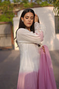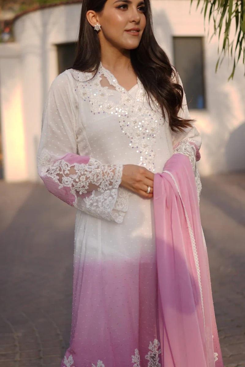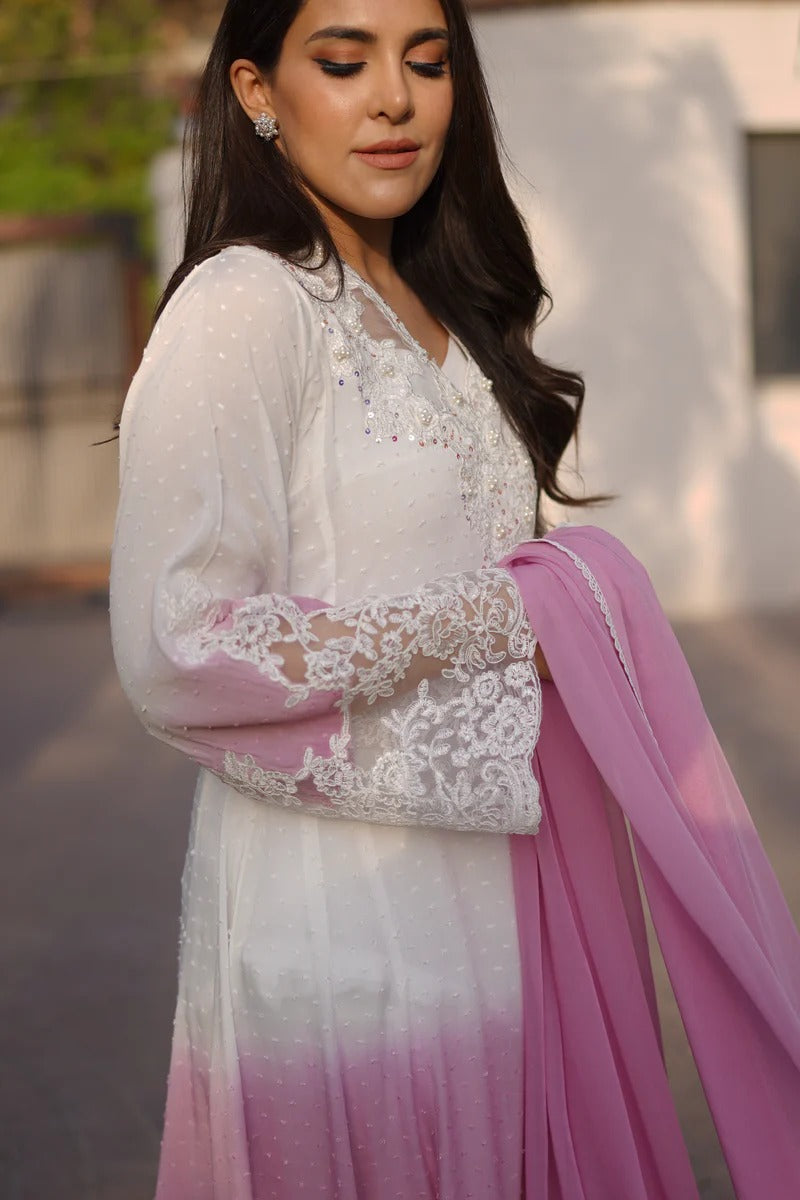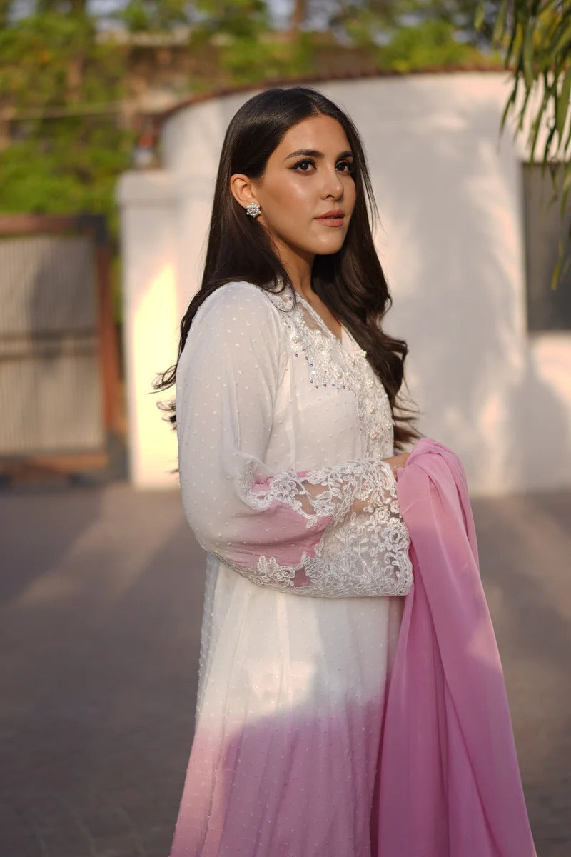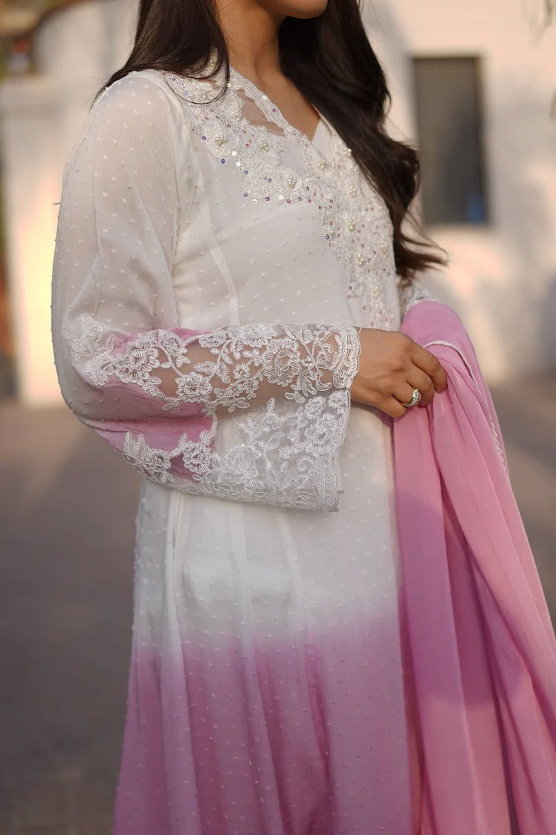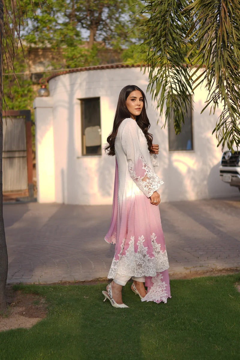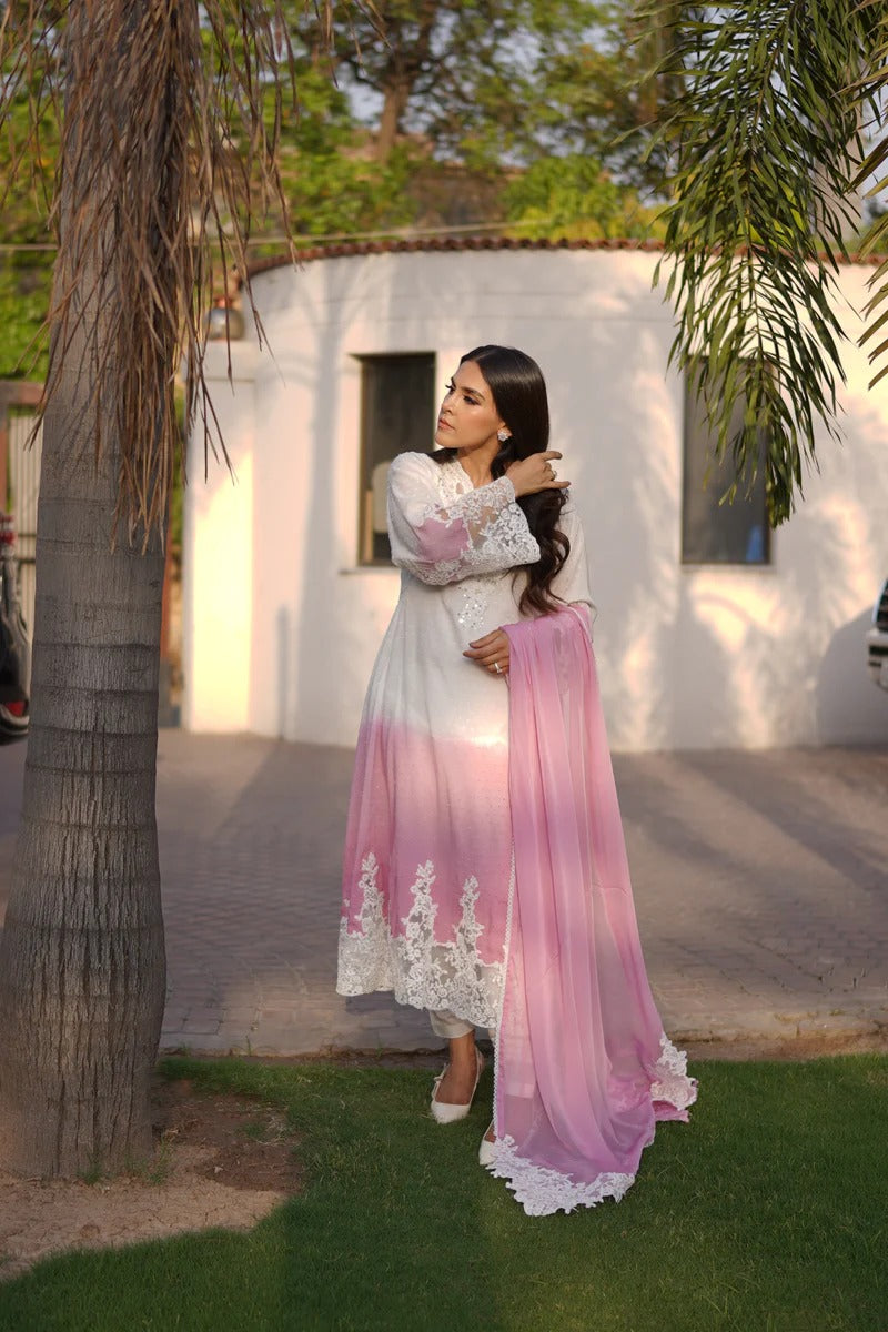 appliquéd lace hemline and sleeves for a touch of delicate elegance. It is paired with a luxurious silk shalwar featuring intricate cutwork.