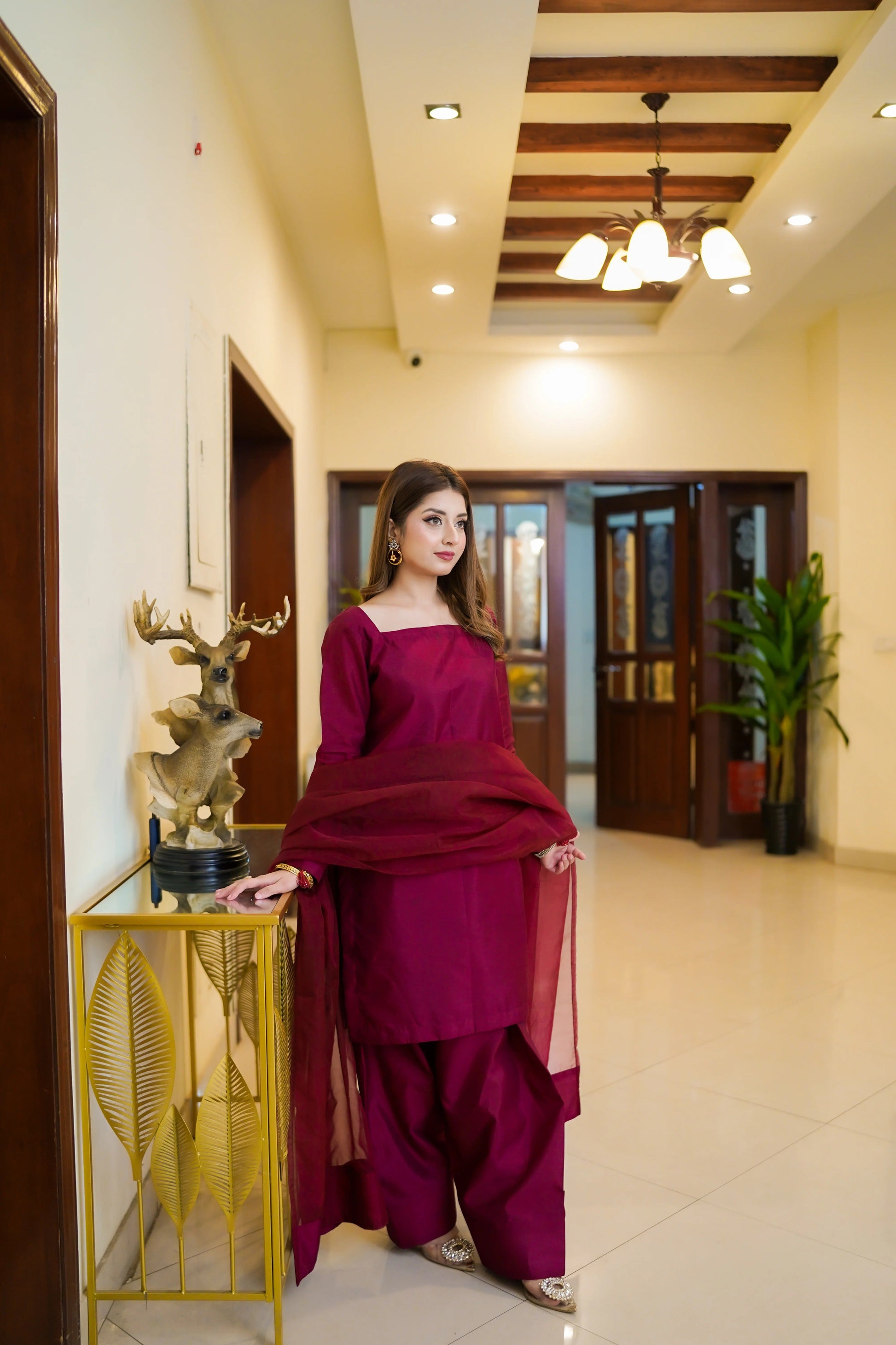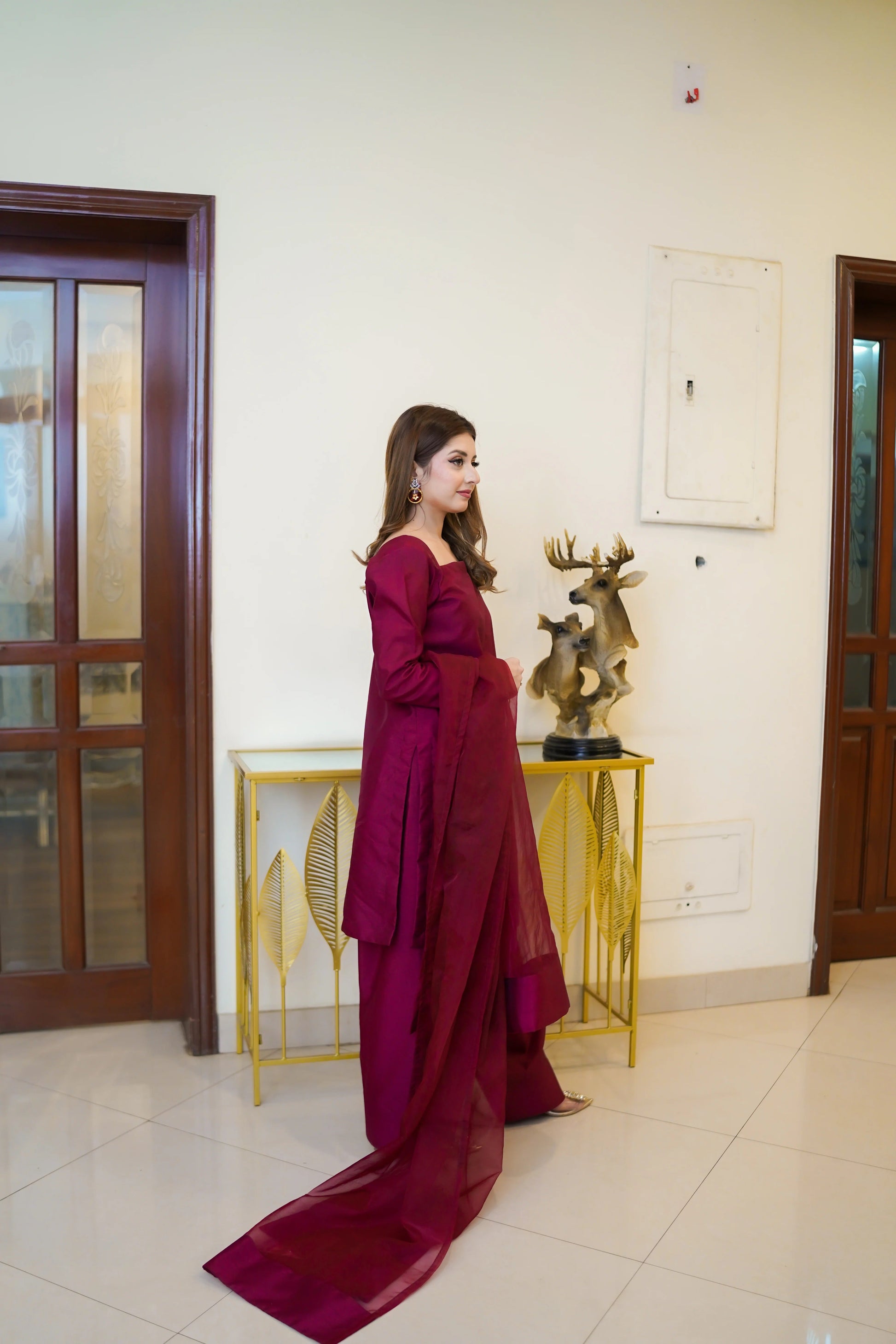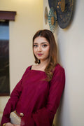 Embrace the richness of autumn with our exquisite maroon farshi shalwar set.