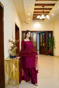 Indulge in the beauty and comfort of our maroon farshi shalwar set, a timeless classic for any wardrobe.