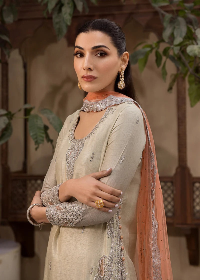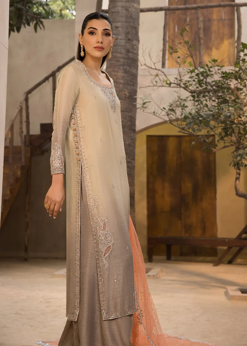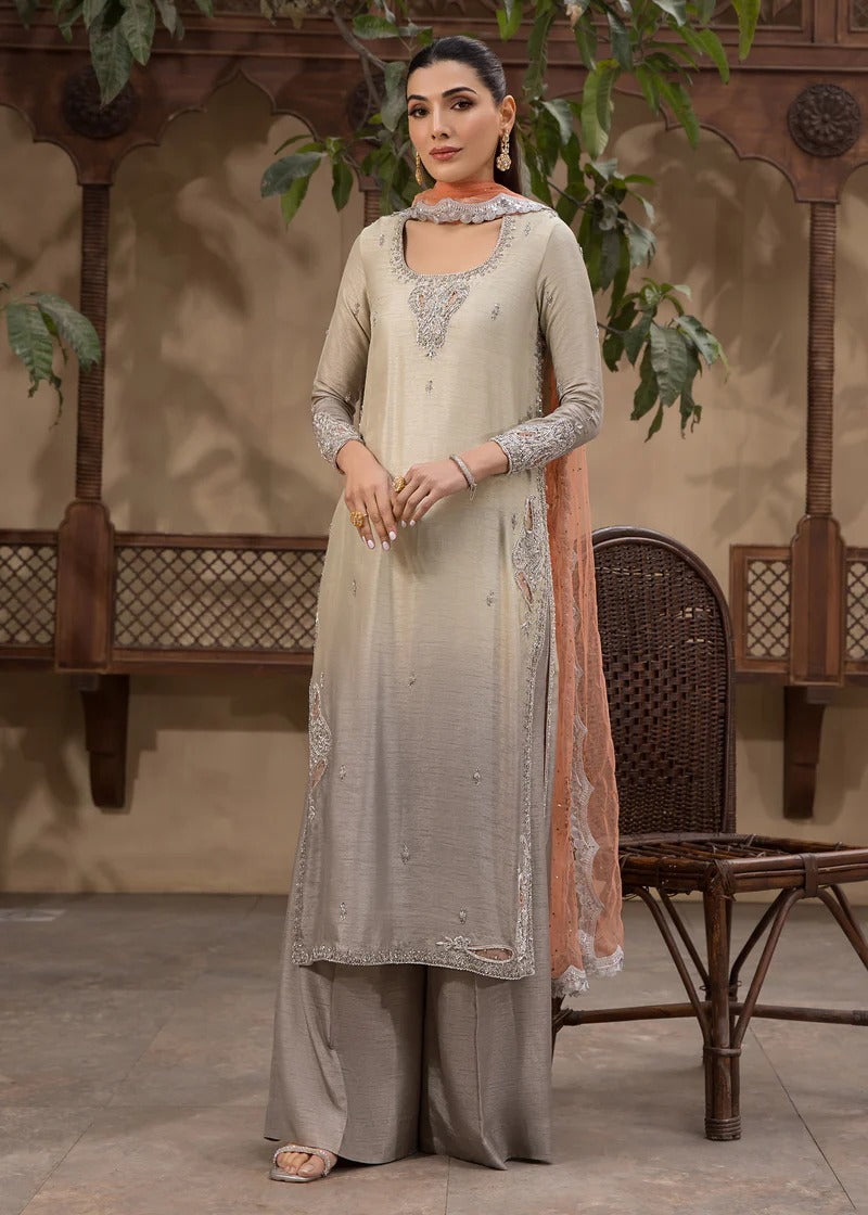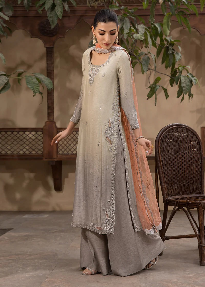 Full Length Ombre Grey hand embelished shirt with ajar pants and orange mukesh dupatta.